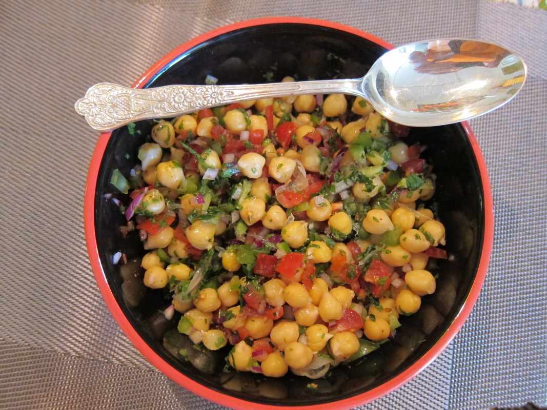 A healthy salad with protein-rich chickpeas or garbanzo beans (kabuli chana in Hindi), and crunchy fresh veggies and herbs, leaving a fresh, clean taste in