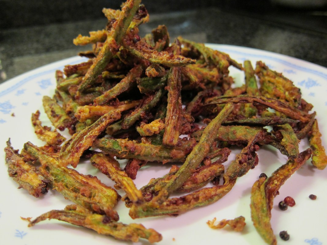e oil is hot enough, add a little piece of okra, and if it immediately rises to the surface of the oil, the oil is hot enough). Add the okra in small batches, fry till they start turning a golden brown. Warning- when you add the okra in the hot oil, oil may splatter, so be careful! Remove and drain on a paper-towel lined platter. Sprinkle some sea salt or rock salt and the ever-versatile Chaat masala, if you have it(a tangy spice mixture found in any Indian store).