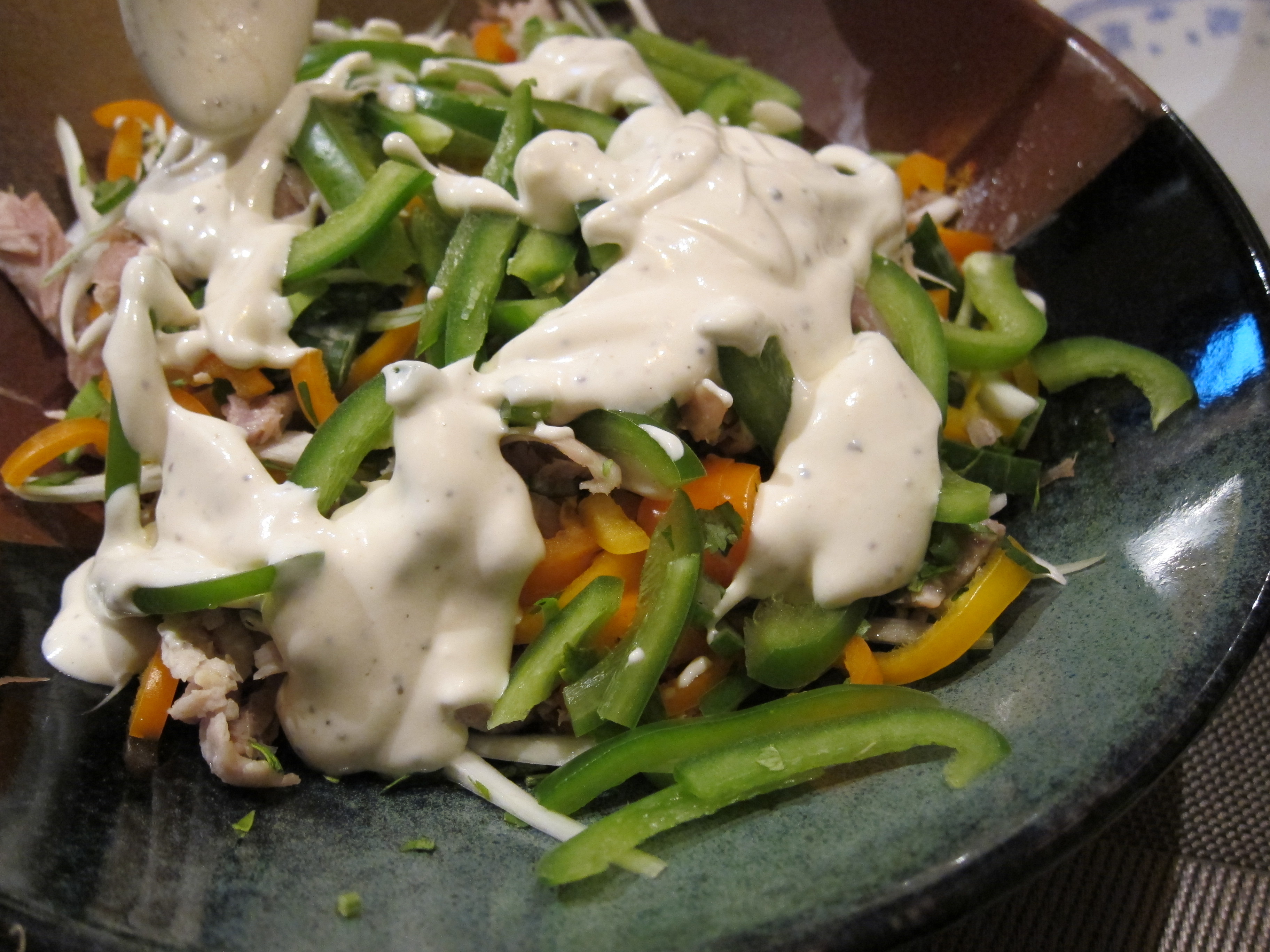 Today, being an unusually warm day this time of year, it’s time to cool off with a chilled, creamy and refreshing salad with crisp veggies and chicken. The idea of concocting and whipping up this salad for dinner tonight, ‘sprung’ in my head, whilst staring at a few poached chicken legs sitting pretty in the fridge. My 8-year old daughter had a rough week, being down with a bad bout of seasonal flu 😦 – yes, spring has its own unpleasant surprises in the form of nasty germs floating in the air! Nothing better to cure a bothersome cold and congested chest, than good ‘ol homemade chicken broth. With the broth greedily gulped down by all of us and sitting pretty in our tummies, I was left with its remnants, namely, poached or boiled chicken legs. I decided to shred the meat and mix it with some raw fresh veggies, nuts and a creamy dressing. I love a creamy chicken salad, with the crunch of onions, fresh peppers and wholesome nuts. It can also be slathered onto fresh bread and eaten as a sandwich. Or dig in a crisp tortilla chip and dig out a dollop of it, aiming straight for your mouth to satisfy your cravings for a tasty appetizer. Simple and filling, refreshing and delicious!