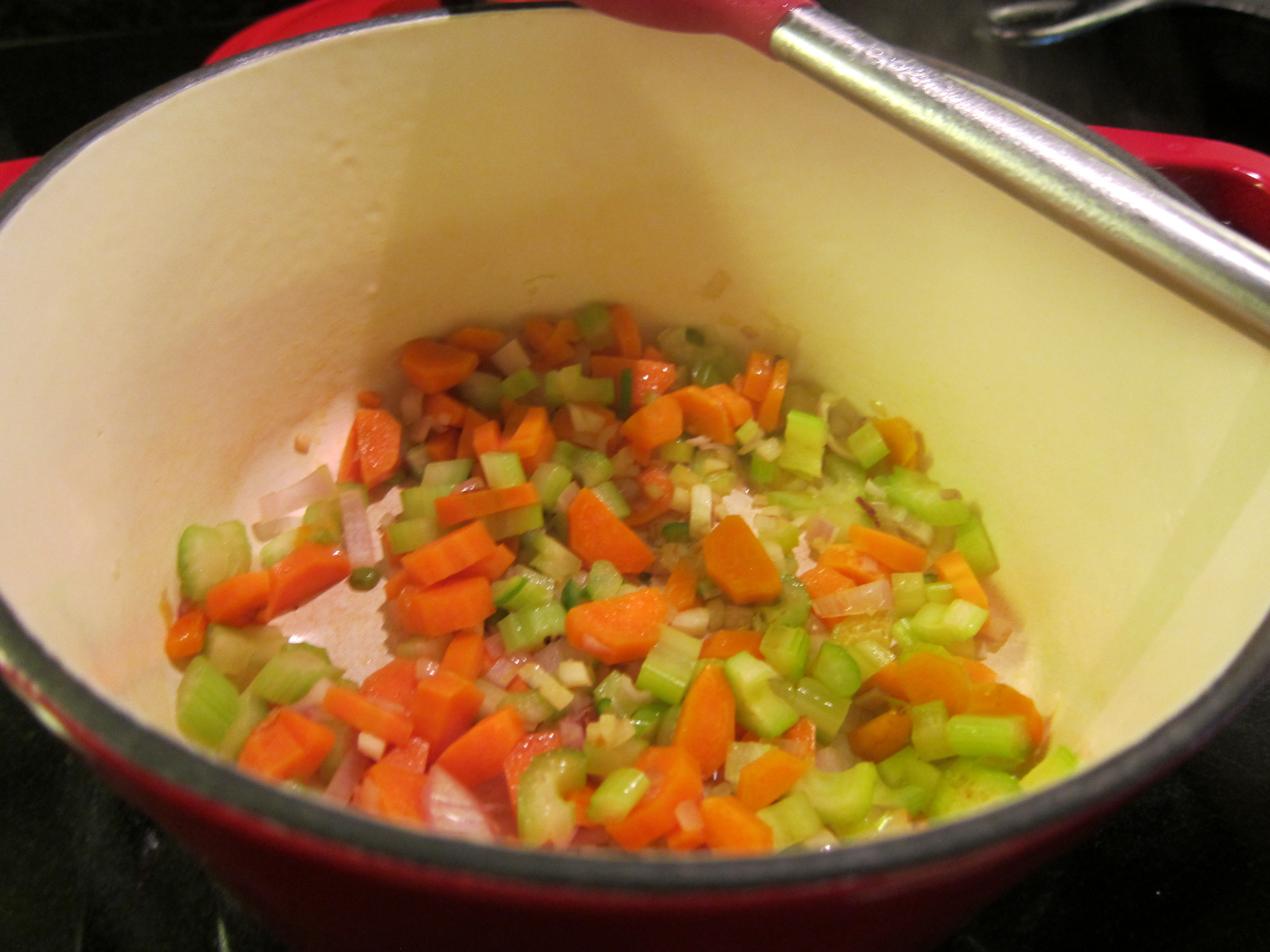 Heat olive oil in a Dutch oven or soup pot over medium high heat. Add the chopped onions, carrots and celery and sauté for a few minutes. Add little salt.