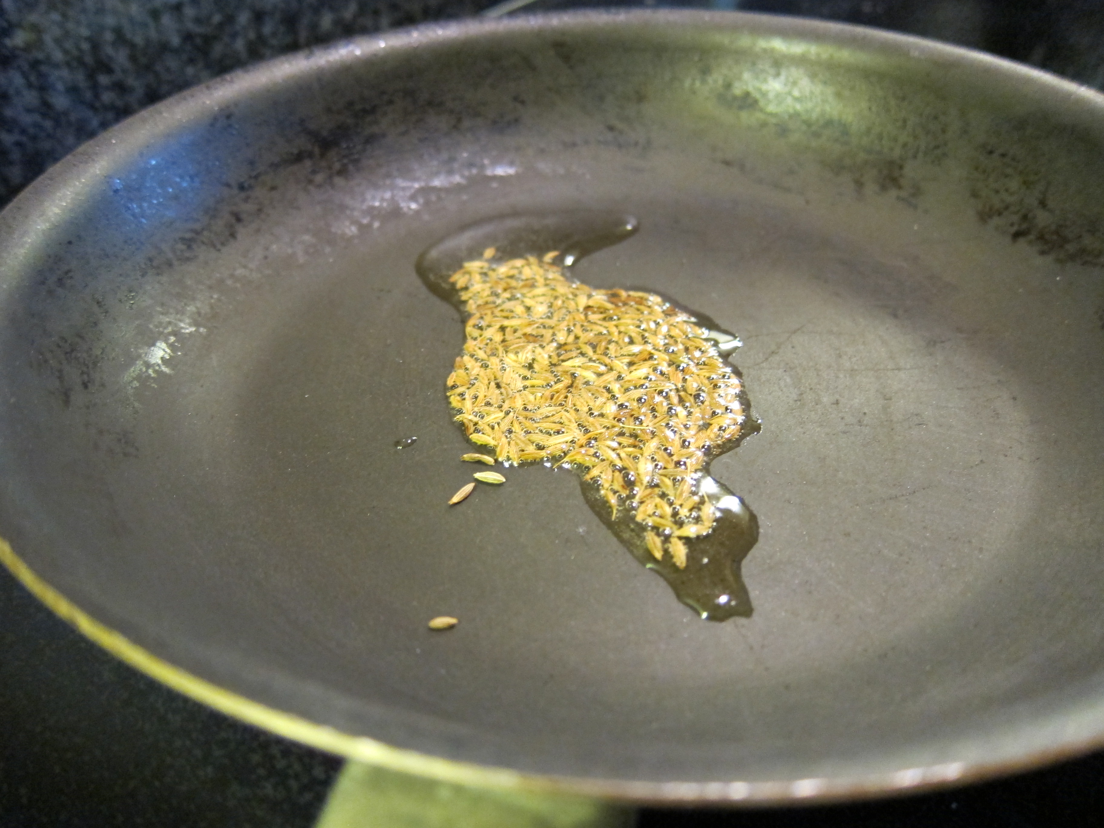 In a small fry pan, heat the ghee. Add the cumin seeds.