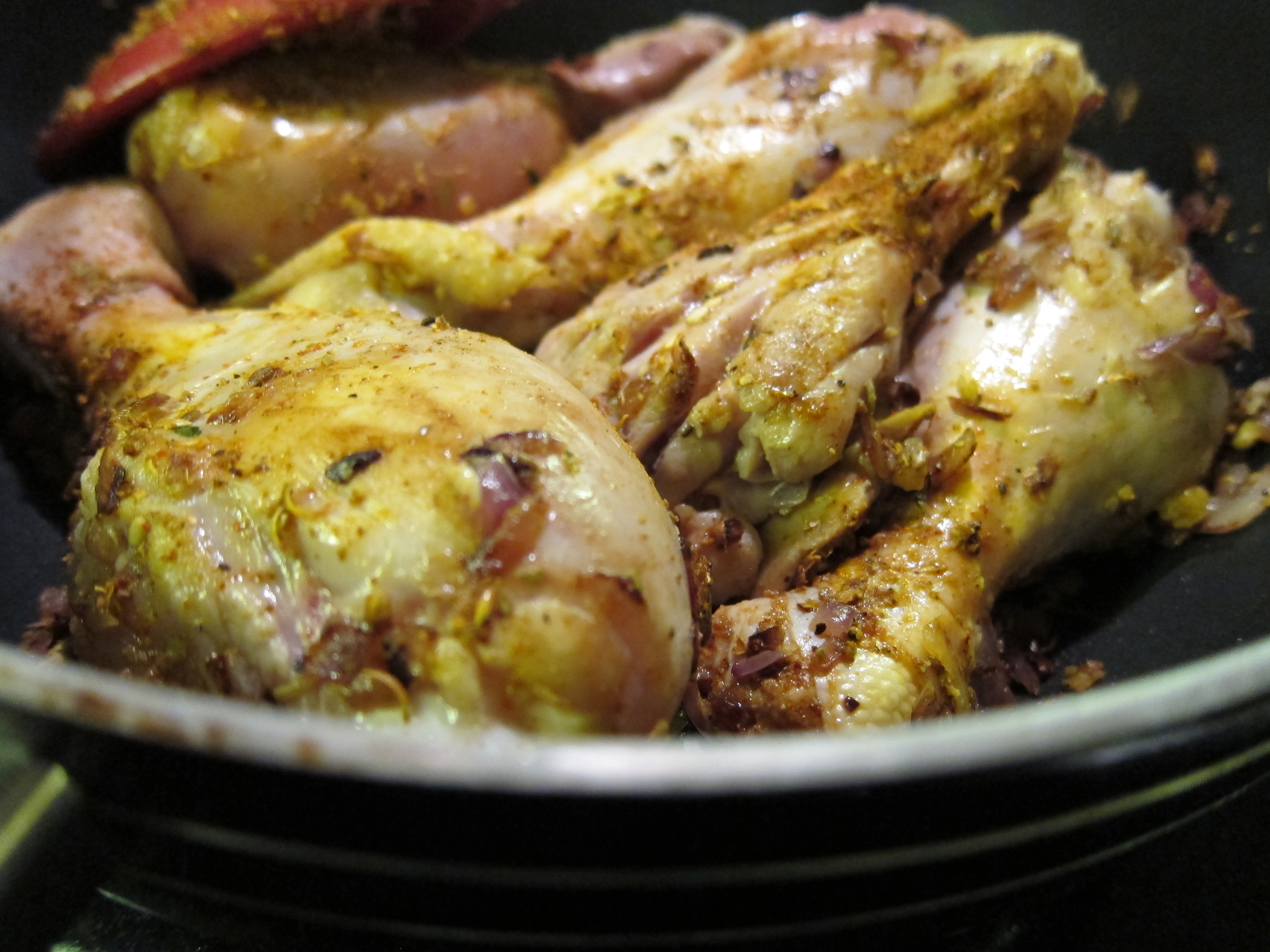 Heat oil in a non stick skillet on medium heat. Add all the whole garam masala and bay leaf. Add the chopped onions and sauté for 8-10 minutes till light golden brown. Add ginger and garlic. Add cumin seeds. Add all the ground spices, including garam masala powder. Sauté for a minute or two. Add the chicken legs and sauté for a few minutes on medium high heat till slightly browned.