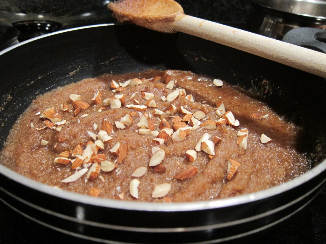 Once the sooji mixture starts turning brown, add the almond meal. Add the ghee and stir for a couple of minutes. Add the sugar syrup, turn the heat on high and bring to a boil. Reduce heat to low, cover and simmer for 5-7 minutes, till the sooji and amaranth are cooked. The mixture should be wettish, not completely dry. Add the cardamoms. Serve hot, garnished with chopped almo