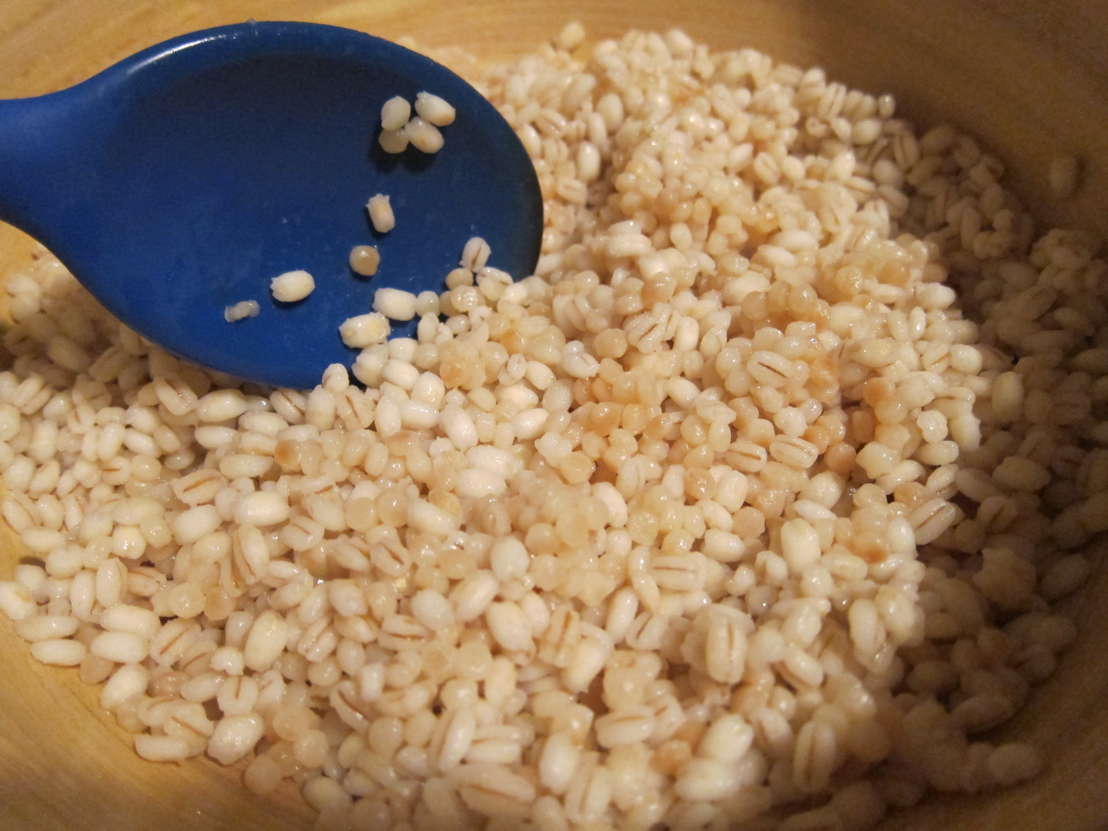 The first step is to cook the barley and couscous. For the barley, combine the barley and 2 cups water. Bring to a boil over high heat, reduce to low heat, cover and simmer for 10 minutes. Remove from heat and let stand covered for 5 minutes. Drain any excess water. Fluff with a fork and season with salt. I basically followed the package directions. When cool, transfer to a big salad bowl.