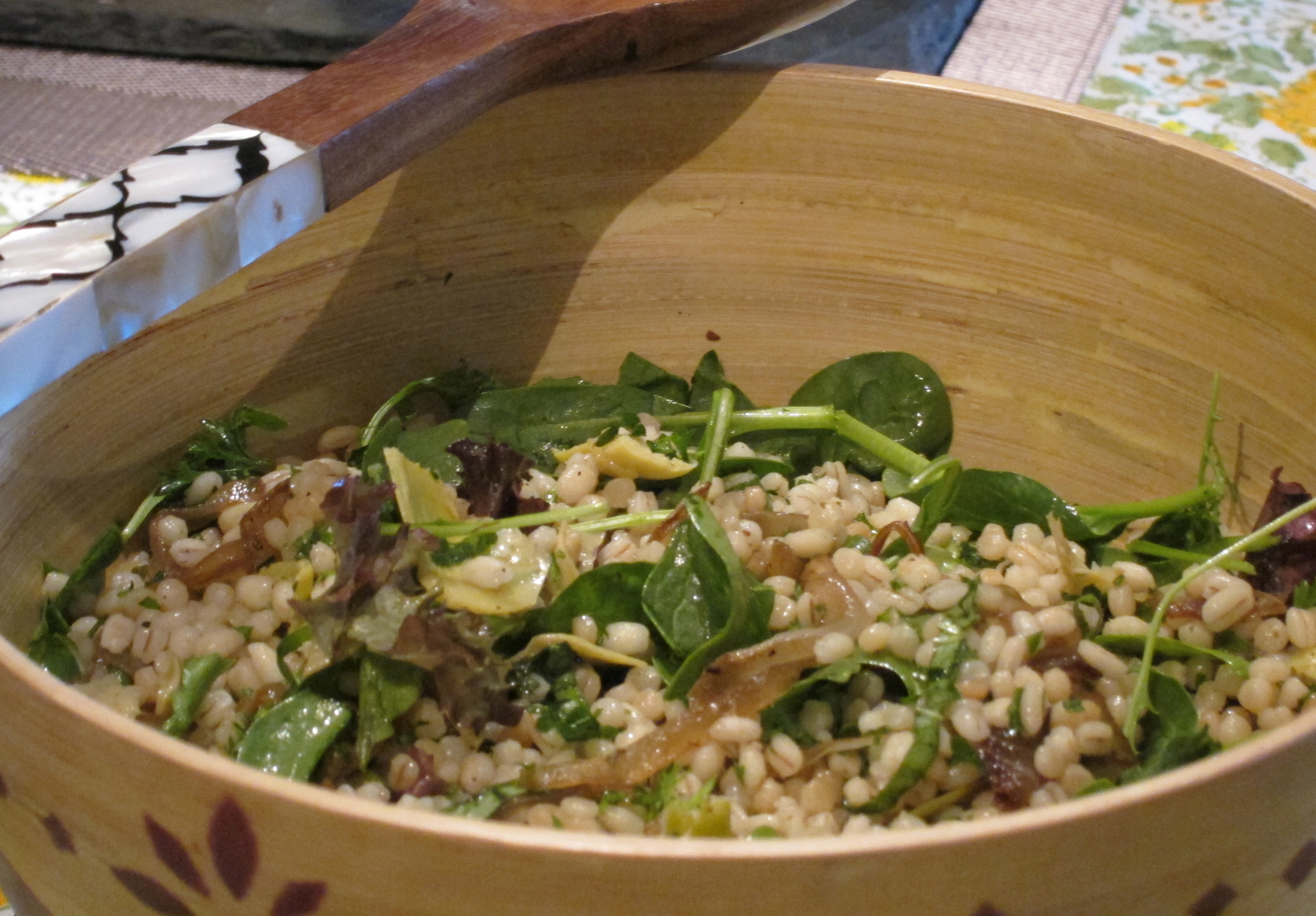 A wholesome vegetarian salad with fresh flavours and a clean, pleasing taste to the palate. I came up with this salad as a last-minute accompaniment to an evening of wine and short-eats (hor d’oeuvres if you may!) at our place with our neighbours. I did not have the time or energy to go to the nearby store to pick up stuff, so I just used whatever I had in my pantry and fridge at the time. A mellow mix and match of wholesome grains, such as nutritious barley, fresh herbs and greens with flavours of caramelised onions, marinated artichokes and a simple olive oil dressing. I used Israeli couscous, which is basically pasta in the shape of tiny balls, it is not that fine as the regular semolina couscous. I picked up whichever herbs I had lying around in my fridge, in this case basil, and Italian parsley. It was all about some chopping, a wee bit of frying, a pot of boiling water and assembling it all as it came together as a delicious and versatile salad, simply perfect for the evening.