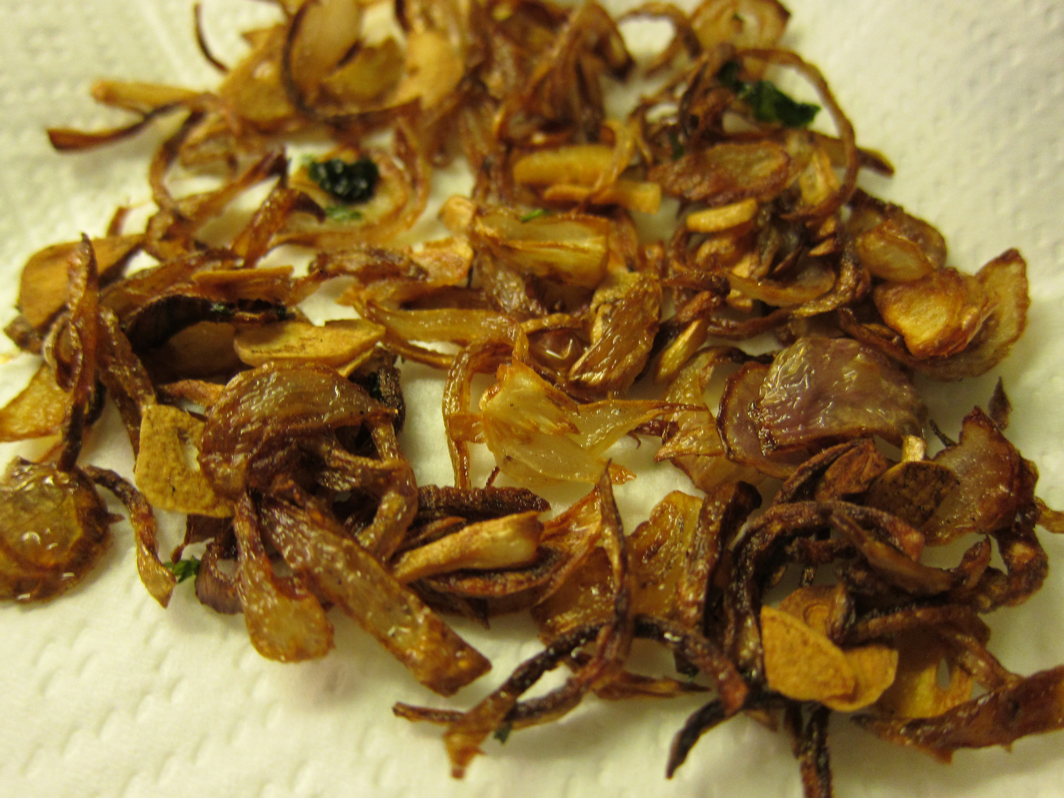 Heat oil in a deep fryer or pan, enough to deep fry the fried ingredients for the salad. Add the shallots, fry till they start turning golden brown, remove and set aside. IMG_3360Similarly, fry the garlic for a few seconds till crisp and light brown. For the shrimp batter, add the flour, rice flour, cold water and salt in a bowl. Lightly mix, if there are a few small lumps, it’s fine. Do not over mix.IMG_3362 Pat the shrimps dry. Add to the batter and deep fry for 2-3 minutes, till shrimps curl up and turn a light golden brown.IMG_3363 Set aside on a paper towel lined plate,to drain any excess oil.IMG_3364