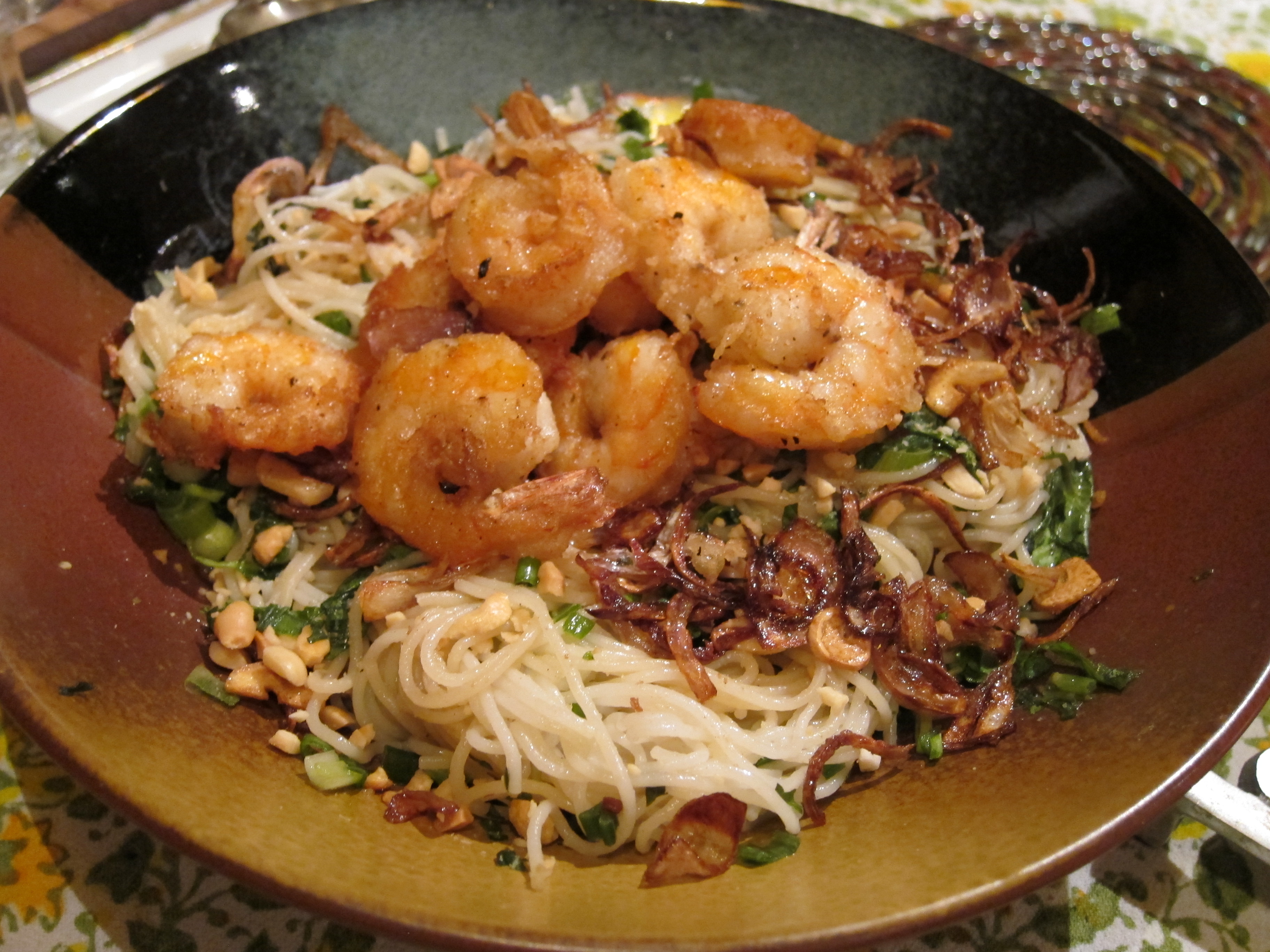 In a large salad bowl, add all the fresh herbs and ingredients, except the shrimp, garlic, peanuts and shallots. Add the vermicelli. Add the vinaigrette and toss well. Garnish with the fried shrimps, shallots, peanuts and fried garlic. The salad is ready to be served!IMG_3367