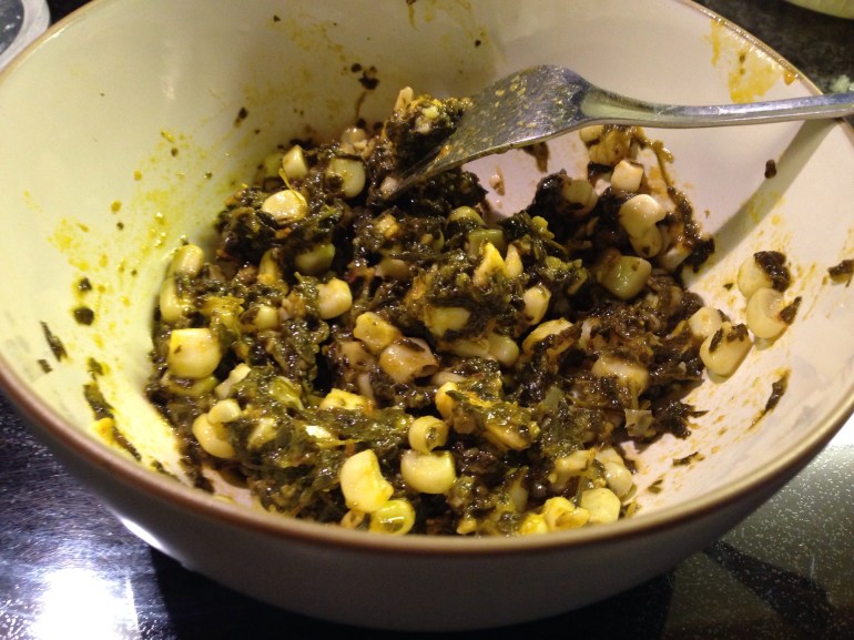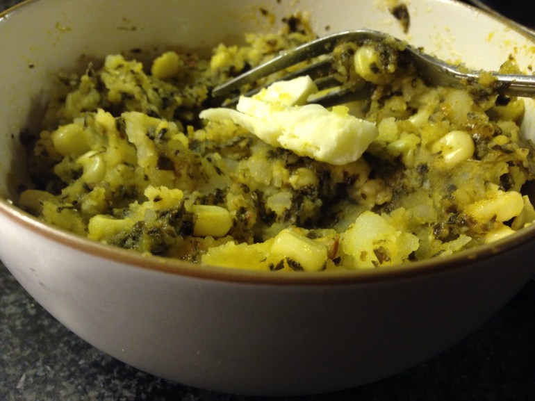 - Mix the potato flesh with the saag paneer(crush the paneer pieces with a fork), corn, salt and pepper to taste accordingly. Add a little milk and a dollop of butter to smoothen out the mixture.