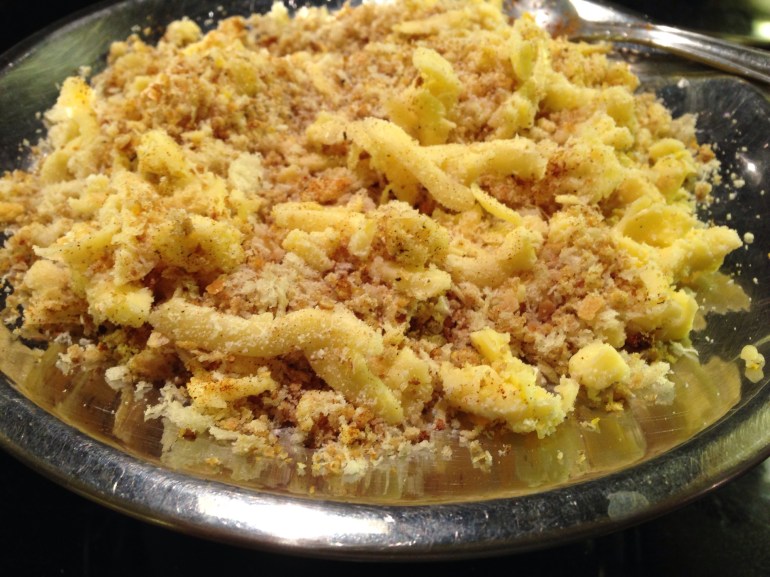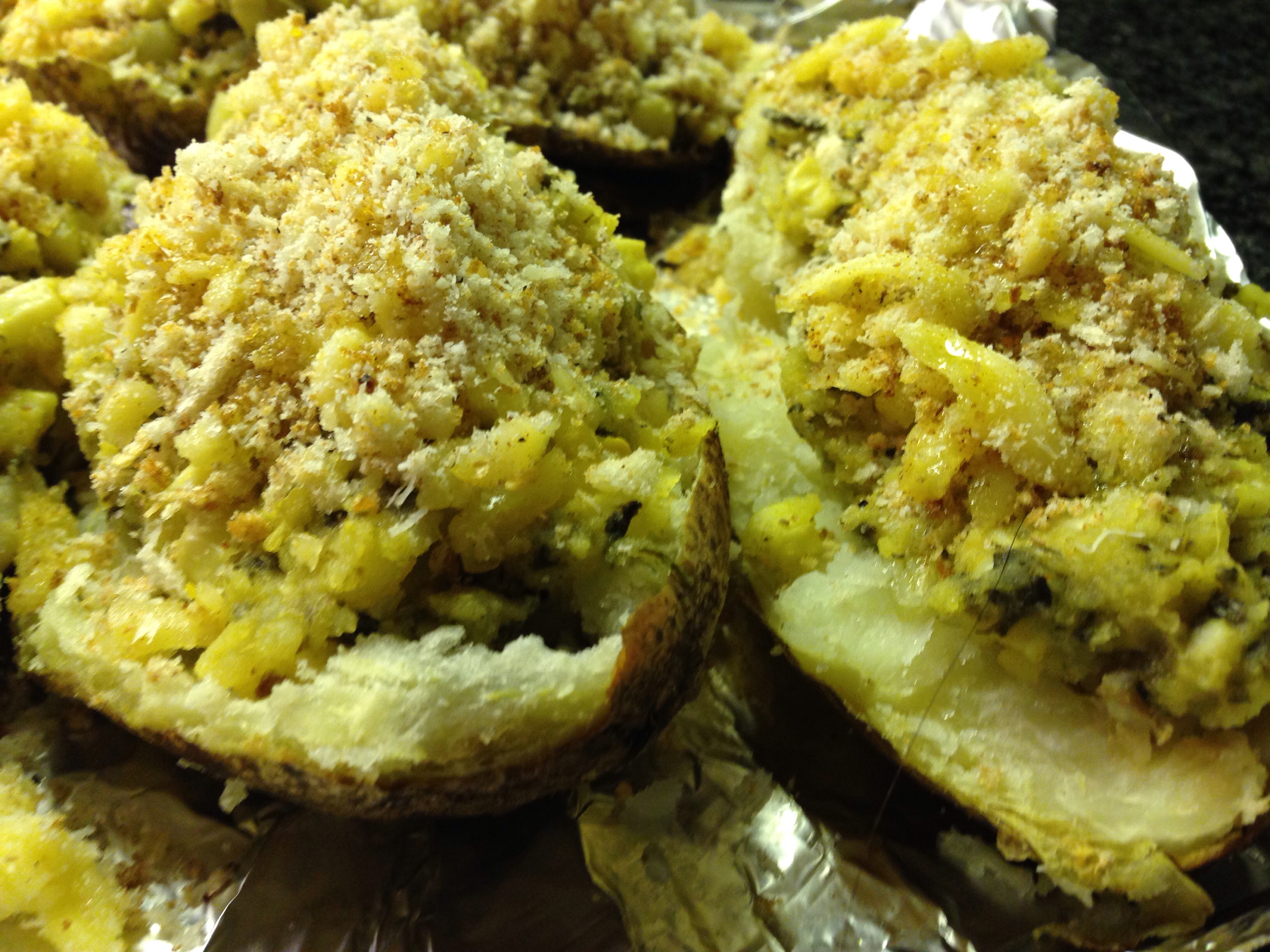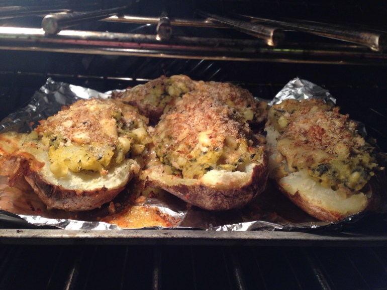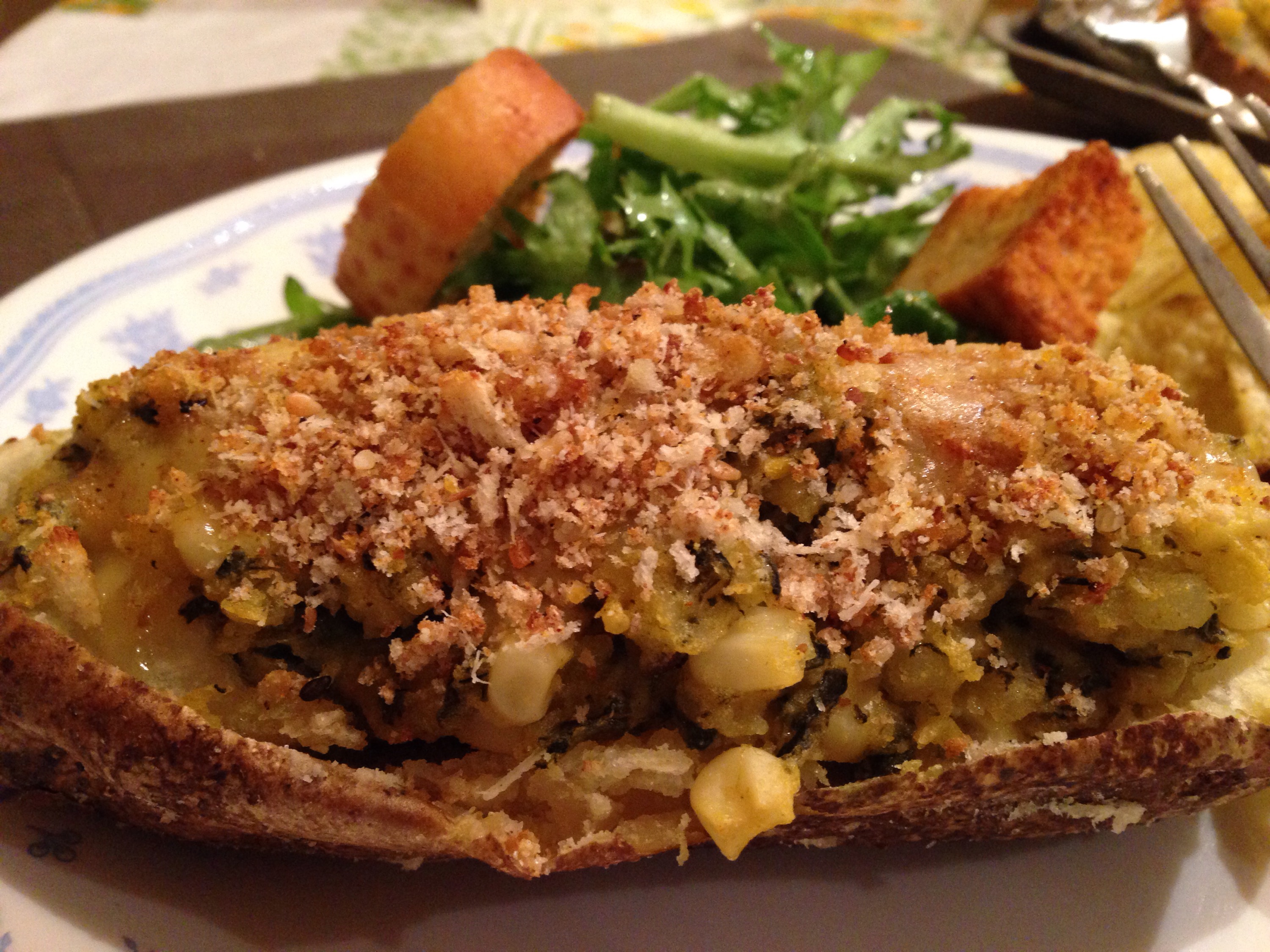 A fully loaded baked Russet potato with the goodness of creamy Dutch Gouda cheese, Parmesan, corn and crunchy breadcrumbs. And leftover saag paneer(Indian cottage cheese and curried spinach) from previous night’s take-out dinner from our unassuming yet very nice neighborhood Indian restaurant. Yup, I gave the good ol baked potato a spin of my own and the result was pretty darn endearing!