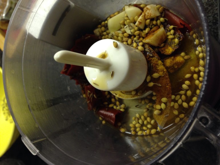 Grind the red chile(without the water), garlic, cumin, coriander seeds, olive oil, vinegar to a coarse paste. Add salt.