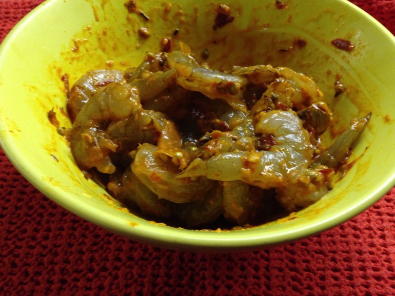 Thinking what to do with fresh shrimp you picked up from your local seafood vendor? Contemplating whether to make a spicy coconut based curry with it, deep fry it(my favourite) or simply grill it? Well, I chose the latter, yeah, even though batter-coated fried shrimp is my all time favourite when it comes to these little crustaceans. I decided to keep the dish simple tonight and make a salad. Trust me, very easy and equally quick to make, no whisking ingredients to make a vinaigrette so typical of a salad. Just some healthy and organic fresh greens and a big, fat and very ripe locally grown avocado to complete the picture. With my Indian culinary roots always intact and my spice cabinet filled with my flavourful spices, I add a touch of heat to the shrimp. It imparts an extra kick. And to cool the palate? The cooling avocado dip compliments it perfectly!