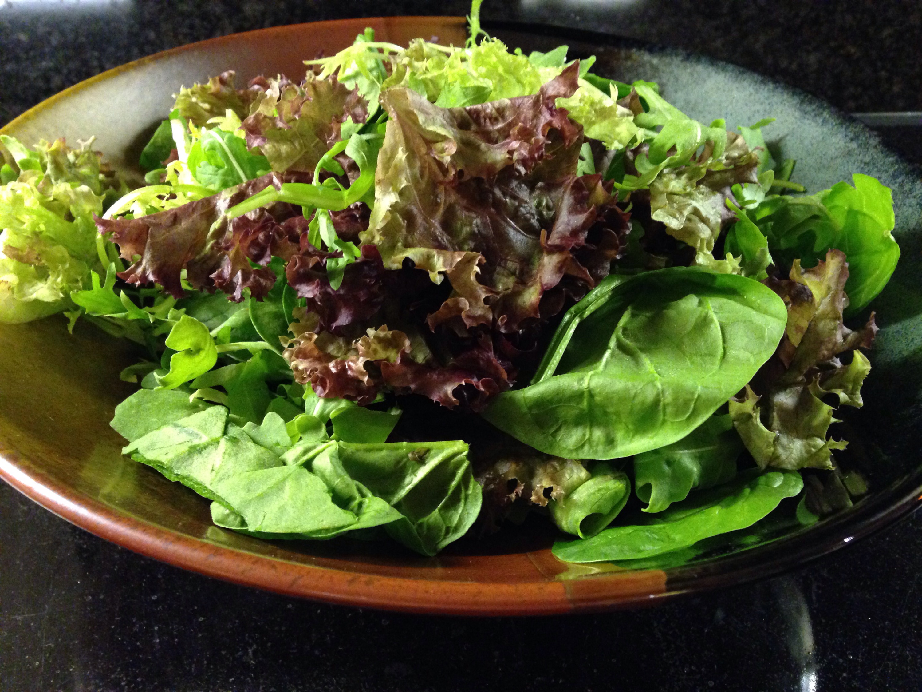 5 cups mixed organic greens, like arugula, green and red lettuce, frisée, radicchio, baby spinach. Even baby kale and chard would work.