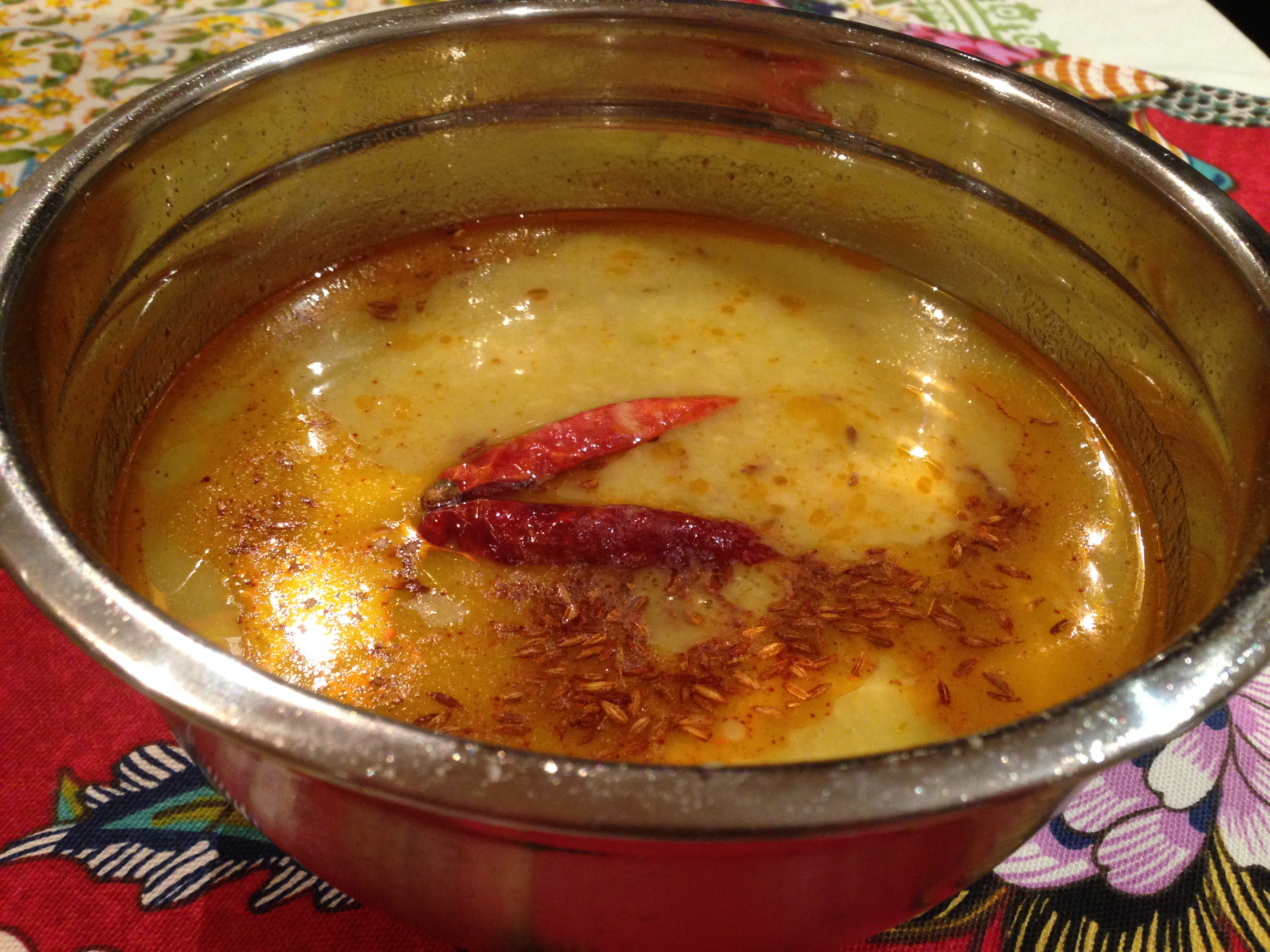 For the tempering, heat a teaspoon of ghee or clarified butter. Add 1/2 tsp. cumin seeds. When they start spluttering, add a pinch of red chile powder. Add it to the lentils, cover for a few minutes. Serve hot with rice!