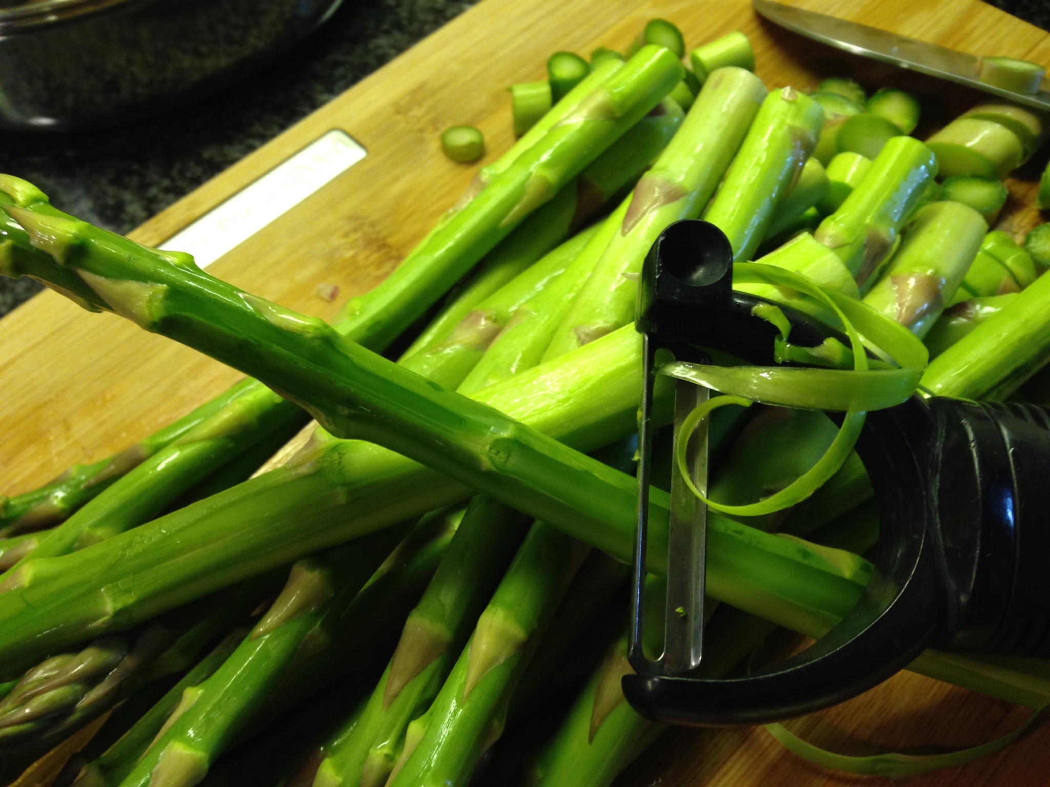 Prepare the asparagus – I like to peel the asparagus spears, just lightly peel with a vegetable peeler. It just helps eliminate any stringy bits in the soup.