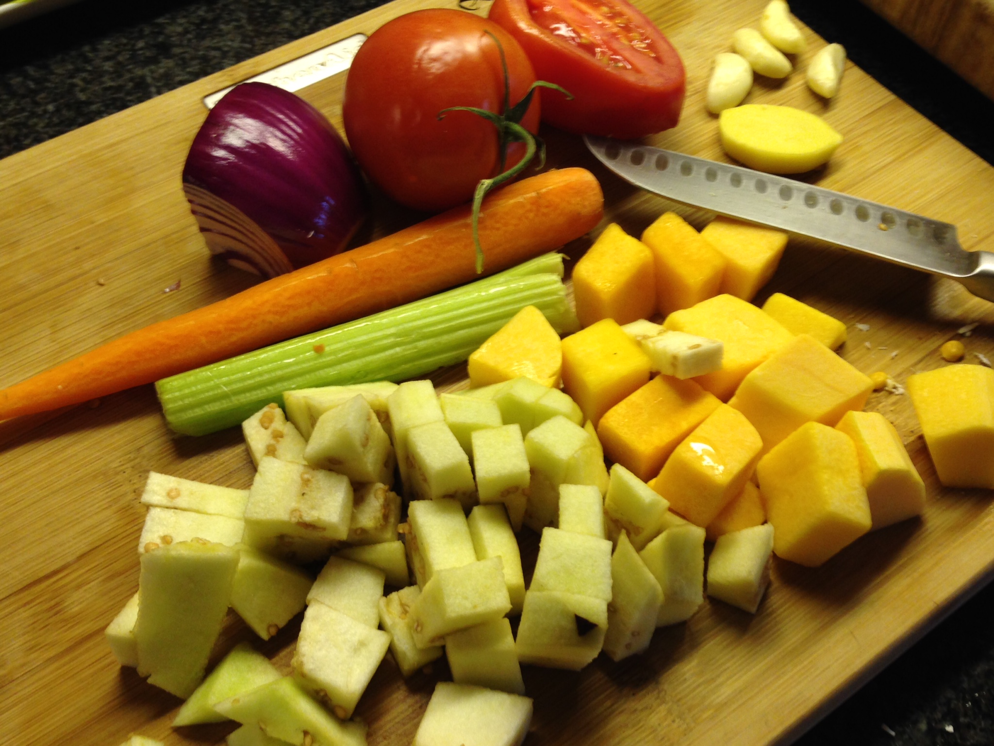 In a pressure cooker, add the lentils along with the chopped eggplant, squash, carrots, celery, onions and tomatoes. Add turmeric and 4 cups of water.