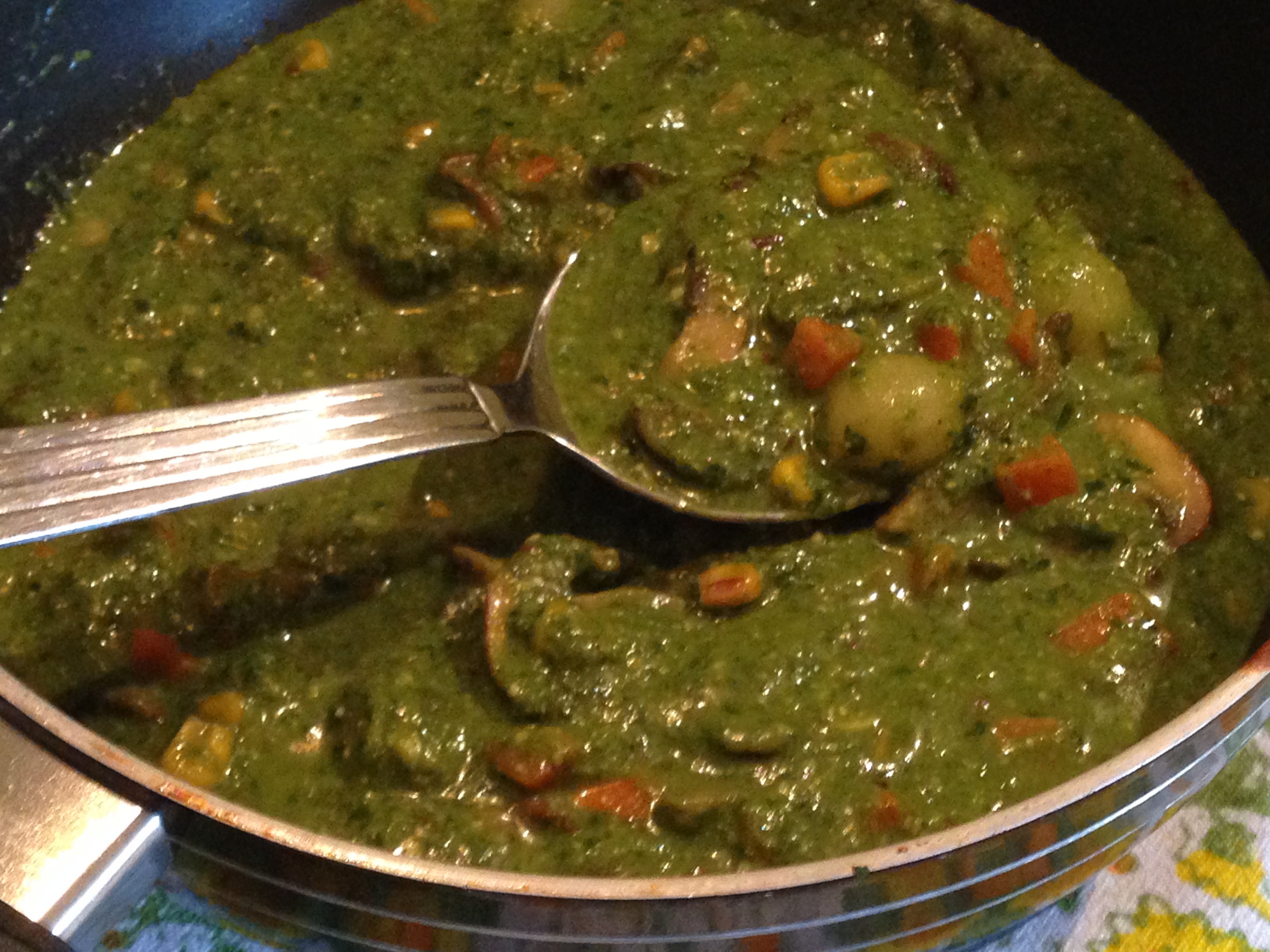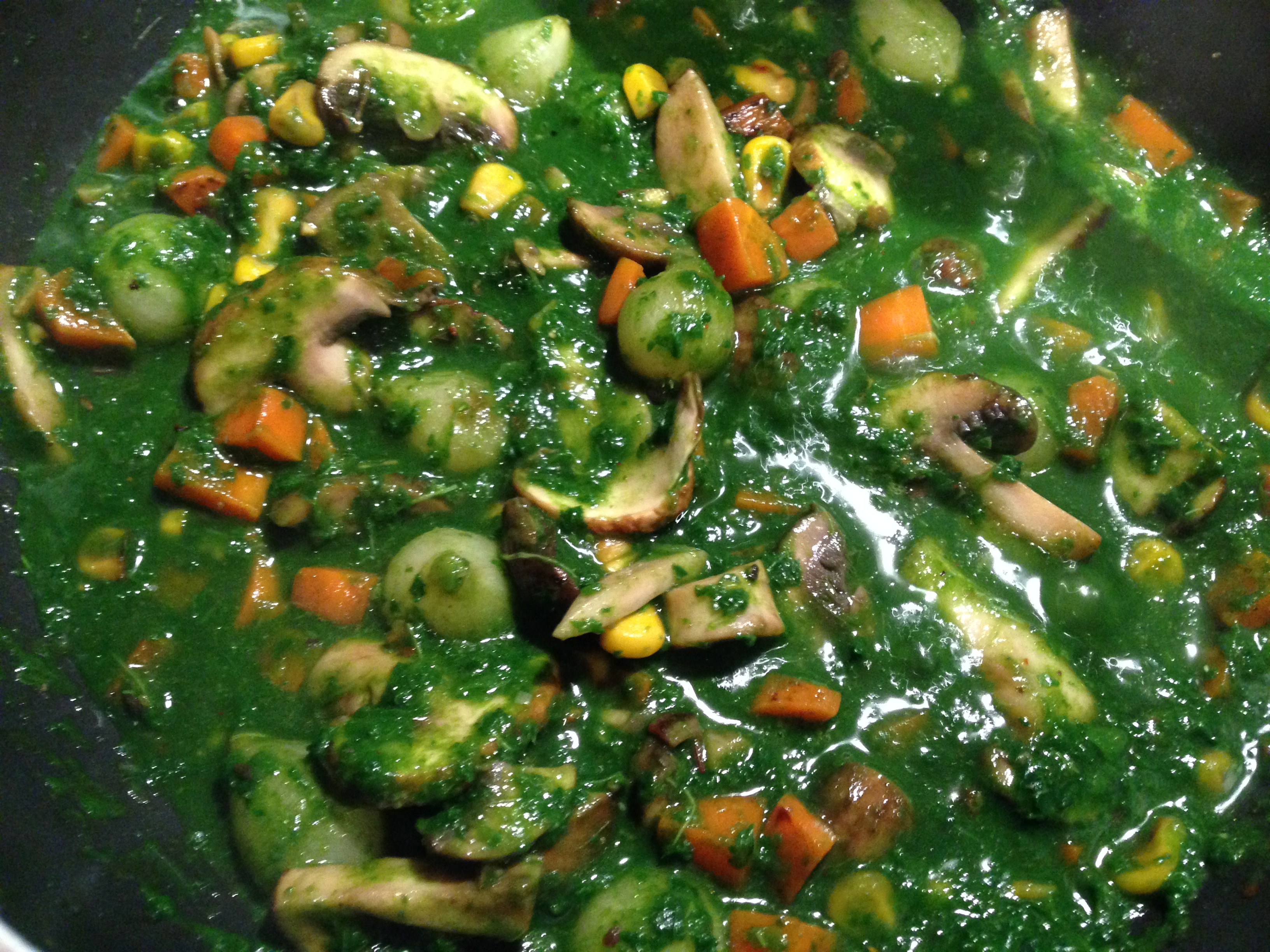 A new and creative recipe, which I tried out in my kitchen for dinner tonight and it turned out downright delicious. Away from the traditional and ever-so popular saag paneer, which is available in every Indian restaurant in every nook and corner of the globe, I decided to add a twist of my own. To interpret the name I have given this recipe, it is a mix of simple and easily available veggies, with fresh organic spinach, in a creamy milk and almond sauce. No paneer, just farm fresh, straight from the farmers market vegetables and greens. Of course, there’s spinach, and a handful of kale too. Carrots, pearl onions, crimini mushrooms, yellow corn, simple! To add flavour to the dish, I added garlic, green chillies, cardamom seeds and a dash of garam masala powder. And lastly, the creamy texture, which not only comes from almonds, but with a bit of bechamel or white sauce. Agreed, one could have just added heavy cream. But I went the extra mile of making an almond paste and some bechamel or white sauce, which trust me was totally worth every minute of the effort.