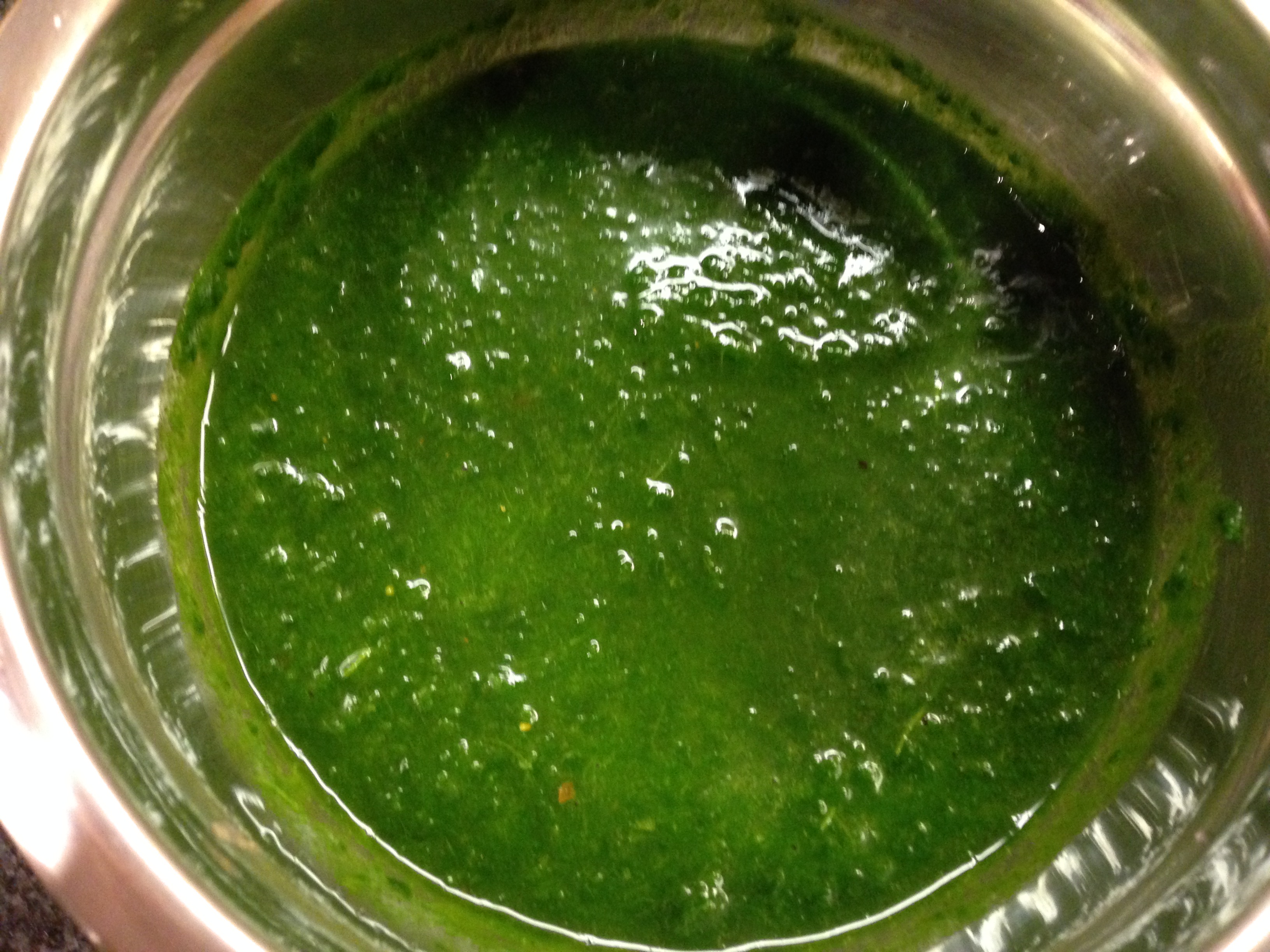 Remove and immediately add to icy water, which helps retain the fresh green color. Drain and blend the greens along with green chillies, cardamom seeds and cloves, in a blender, to make a purée. Set aside.