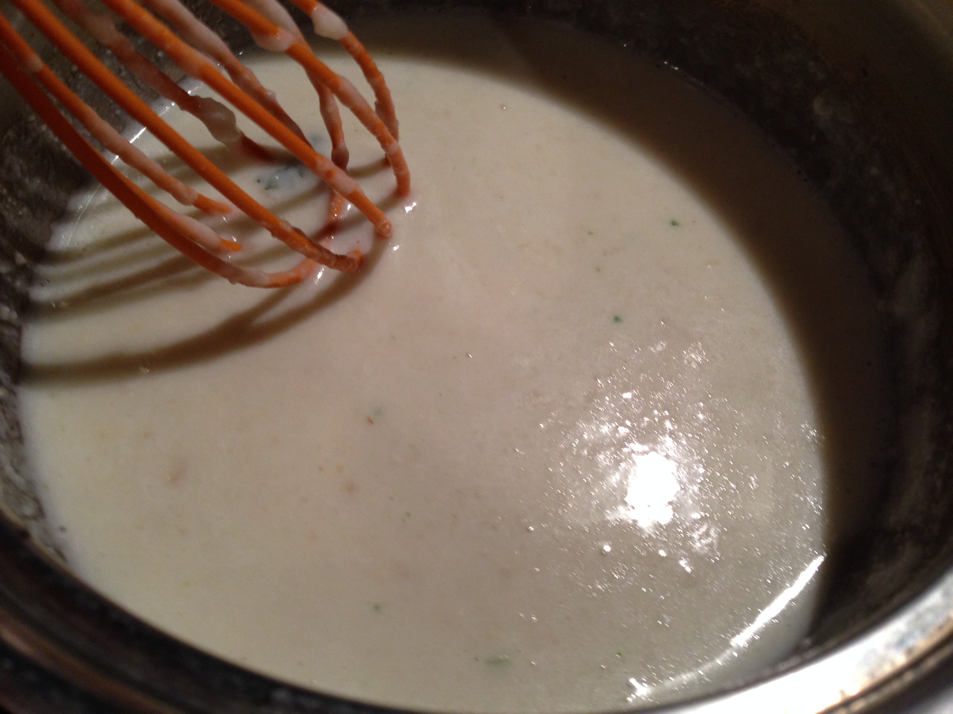 Make sure there are no lumps. Simmer for 5 minutes. Add salt and white pepper, and a pinch of nutmeg. Add the almond purée. Remove from heat and set aside.