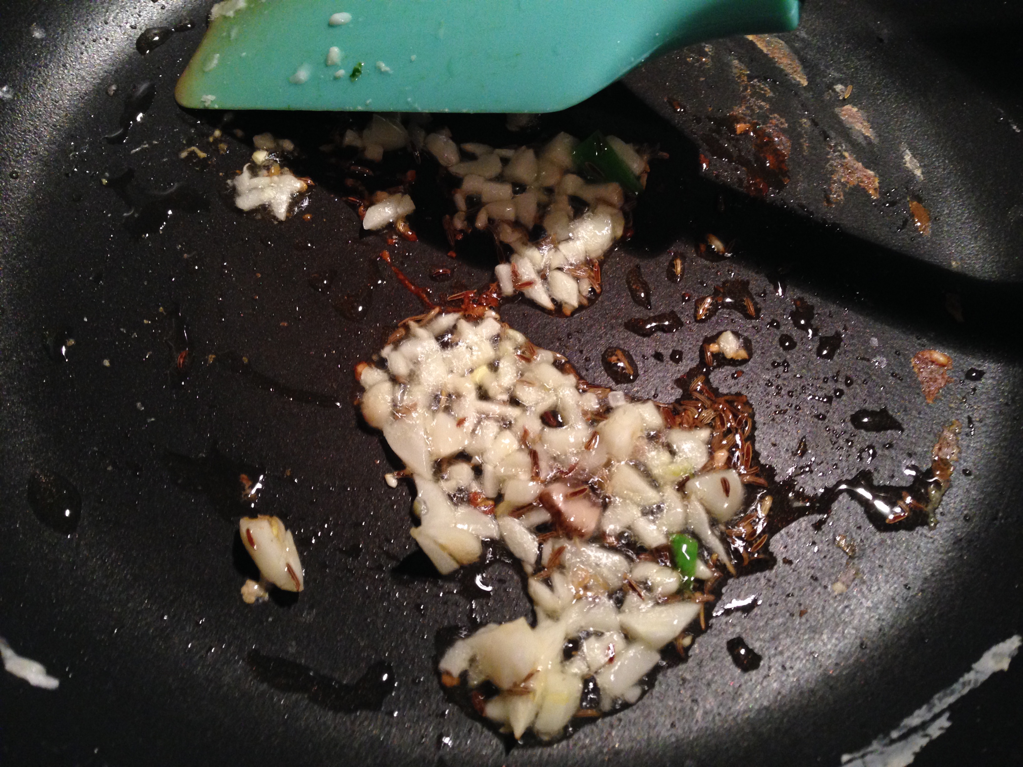 In a large sauté pan, heat the olive oil. Add the cumin seeds. When they start crackling, add the garlic, sauté for half a minute.