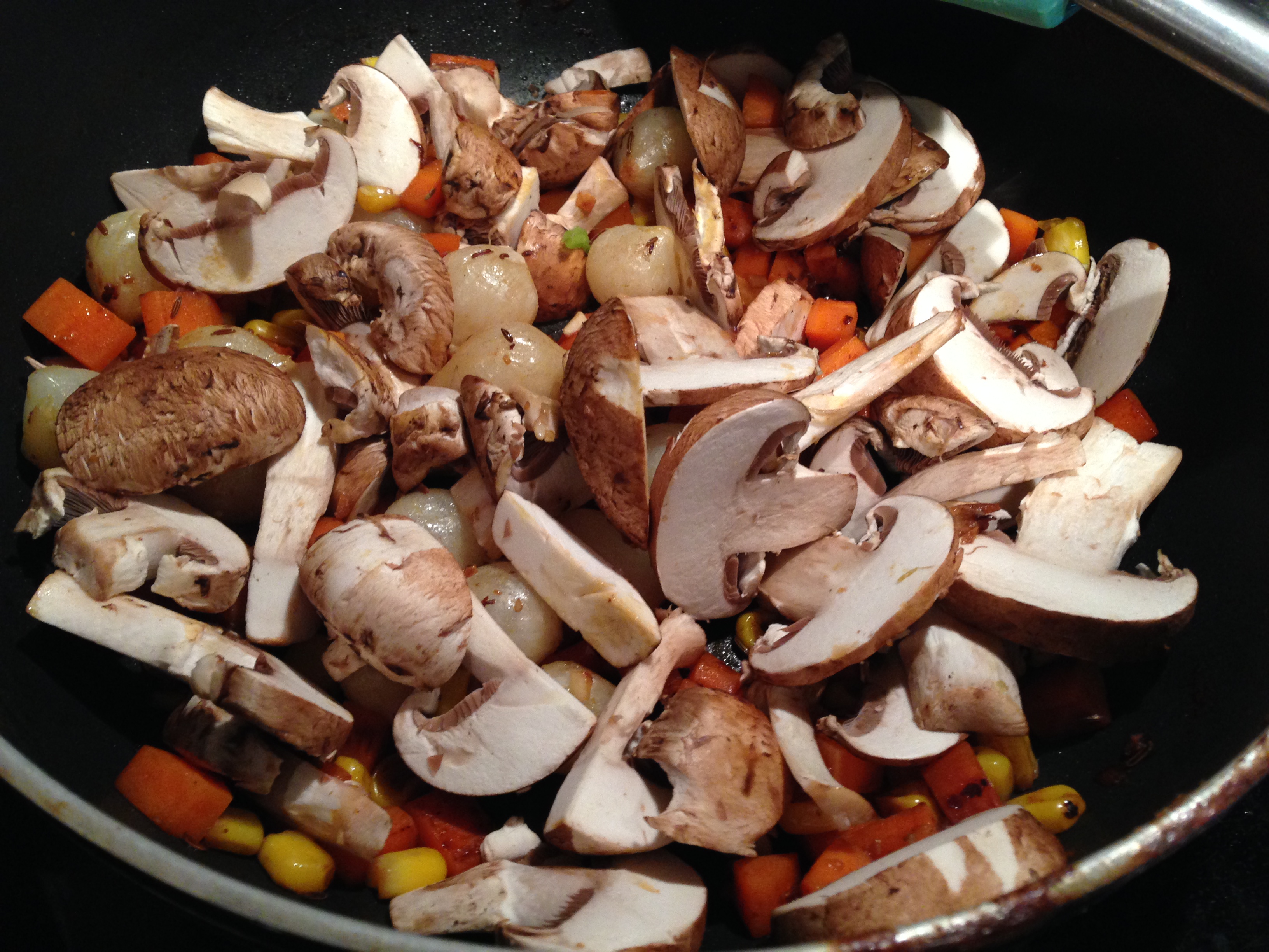 Cover and let cook for 7-8 minutes till the veggies start becoming tender. Add the mushrooms and stir fry on medium high heat for 3-4 minutes.