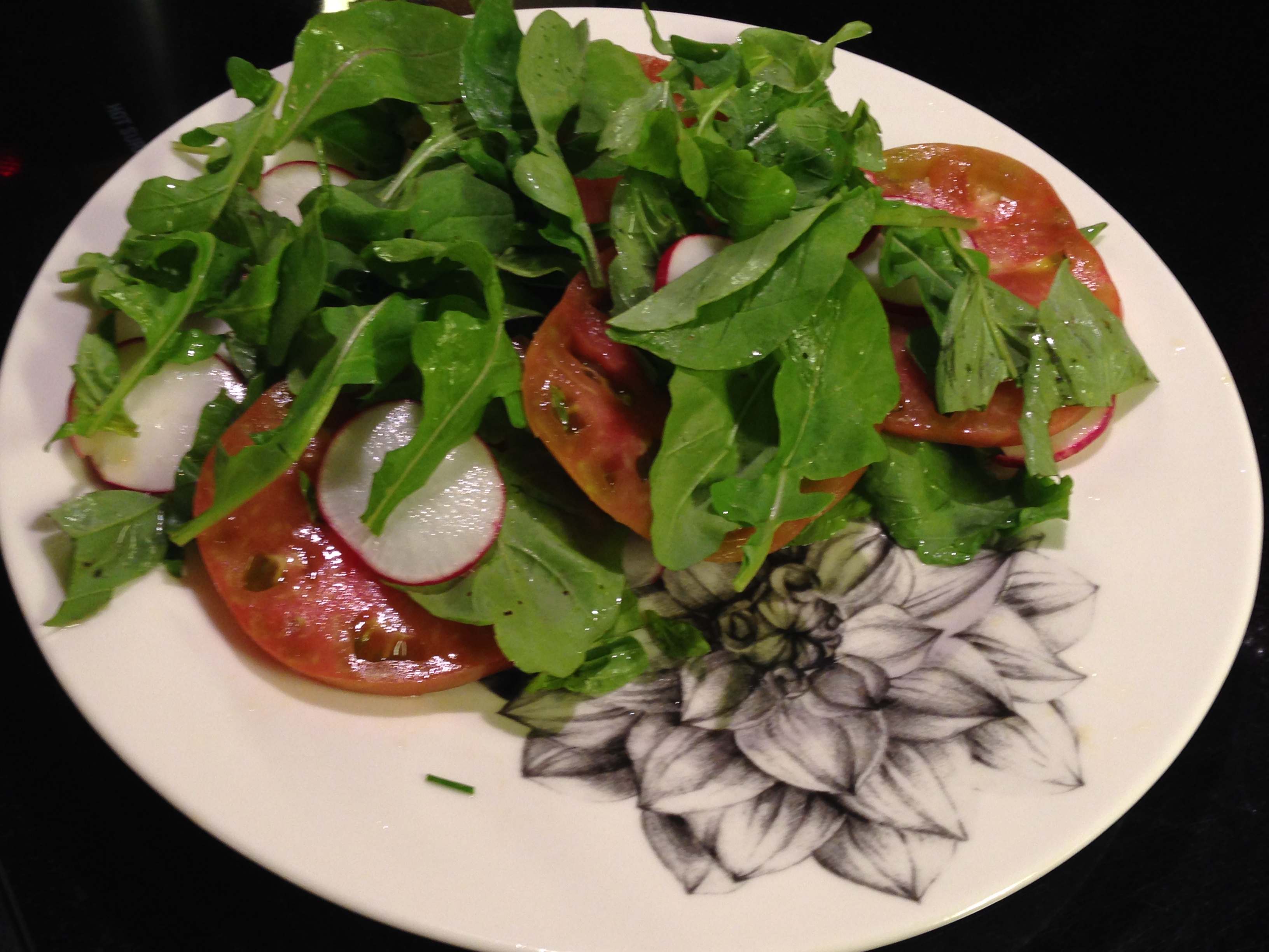Whisk together all ingredients for vinaigrette, salt and pepper and set aside. Arrange the tomatoes, radish, arugula and basil on a platter. Just before serving, pour the vinaigrette. Serve chilled or at room temperature.