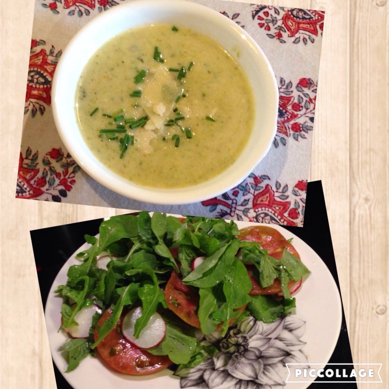 Today’s menu includes an all vegetarian meal- Creamy broccoli soup, without the heavy cream. Just a base of white sauce, a teeny bit of Parmesan cheese (quite like a garnish, frankly) and the goodness of fresh vegetables and herbs. An easy salad to put together, along with a super easy, no fuss vinaigrette. Voila! There you have it, my farmers market inspired, hot comforting soup and a cooling, refreshing salad!