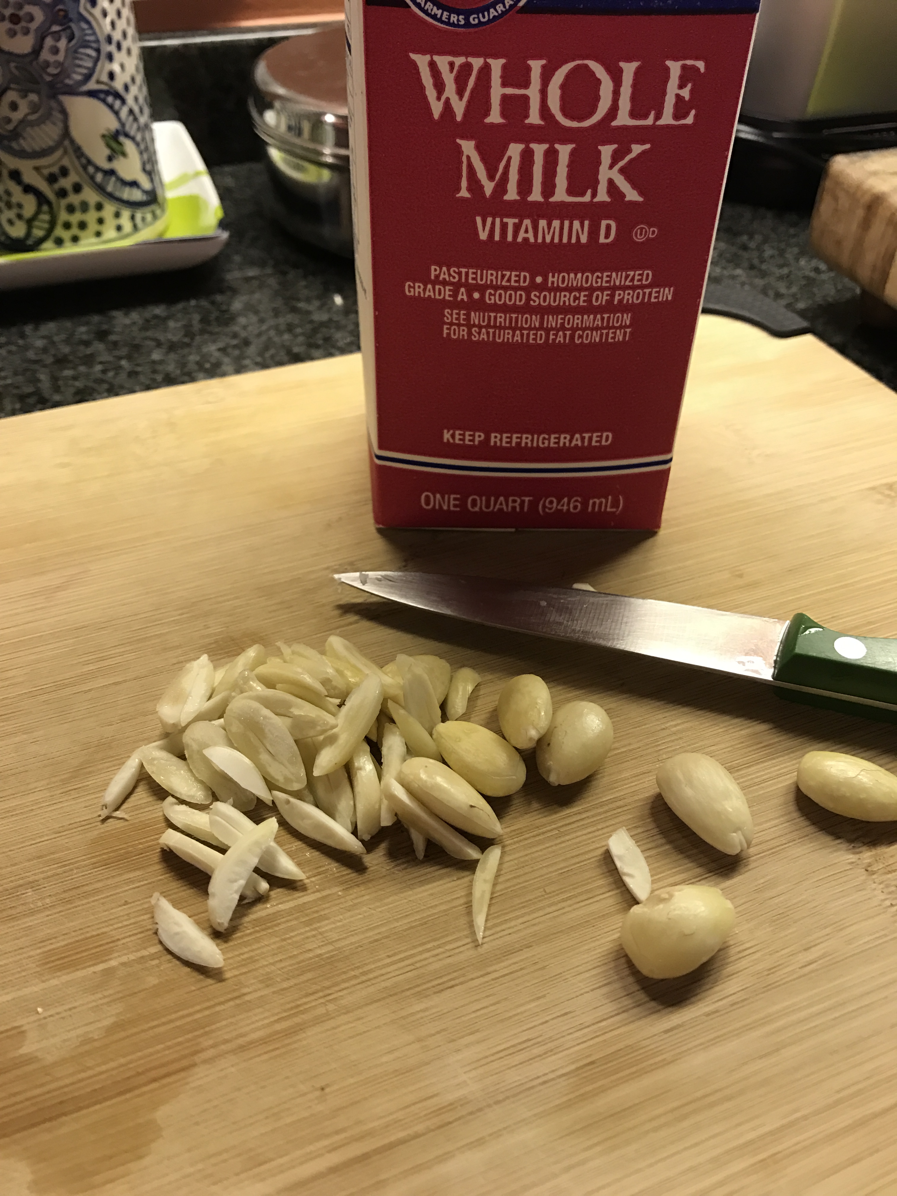 Raw almonds – Soak them in water, I usually soak them overnight. Remove skins and slice into little thin pieces.