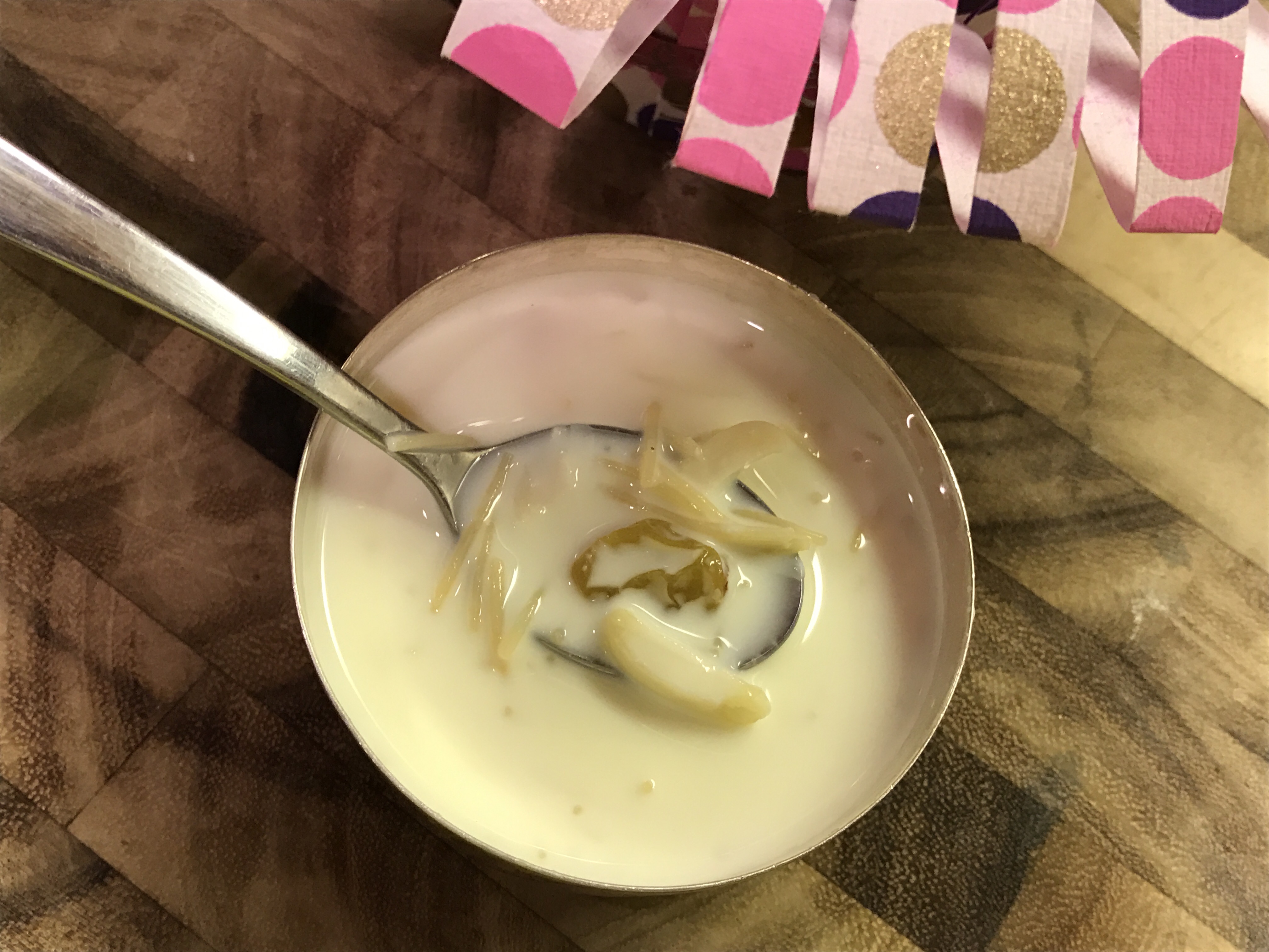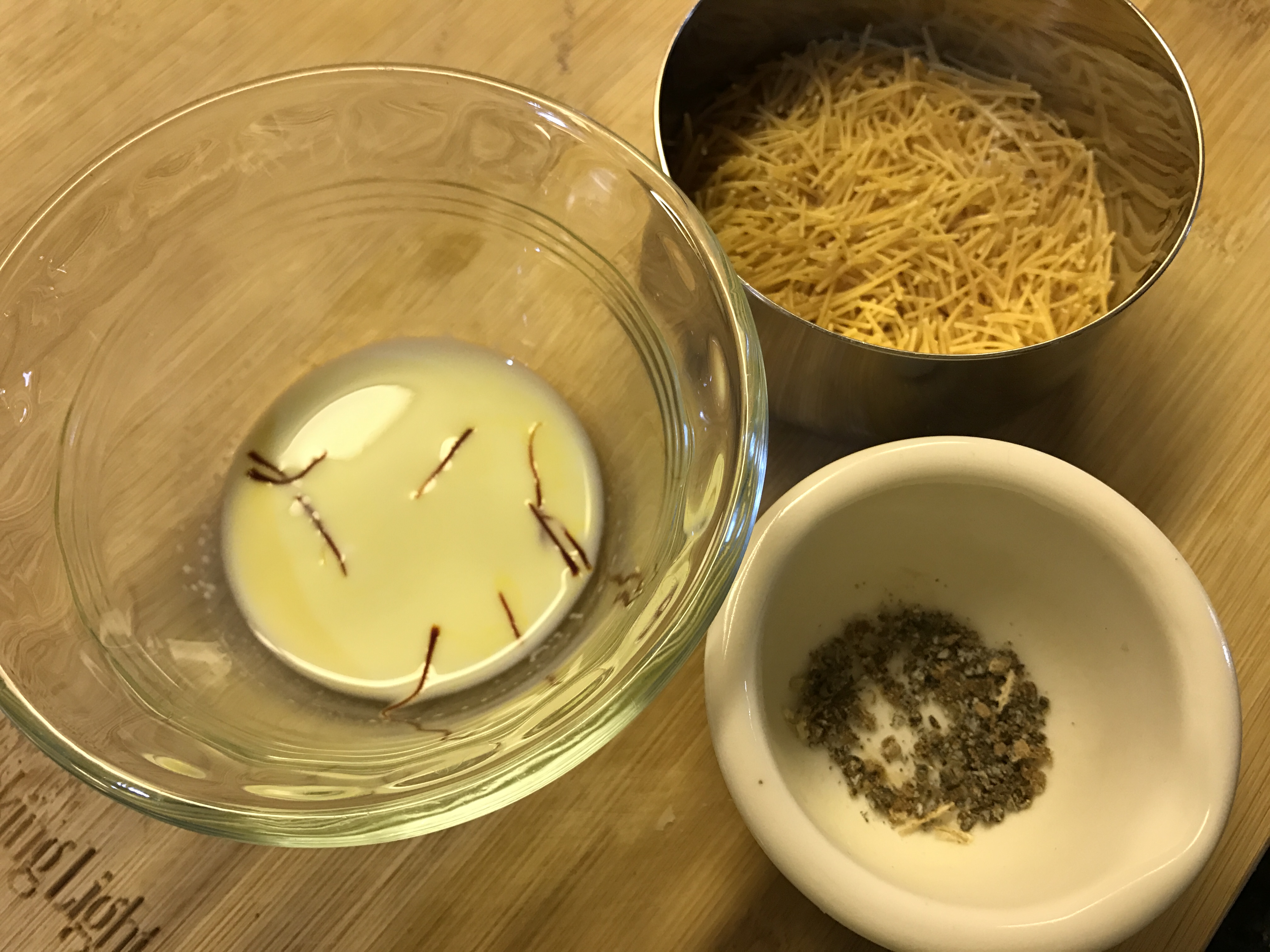 Roasted vermicelli milk pudding with almonds, raisins and flavourings of cardamoms and saffron.