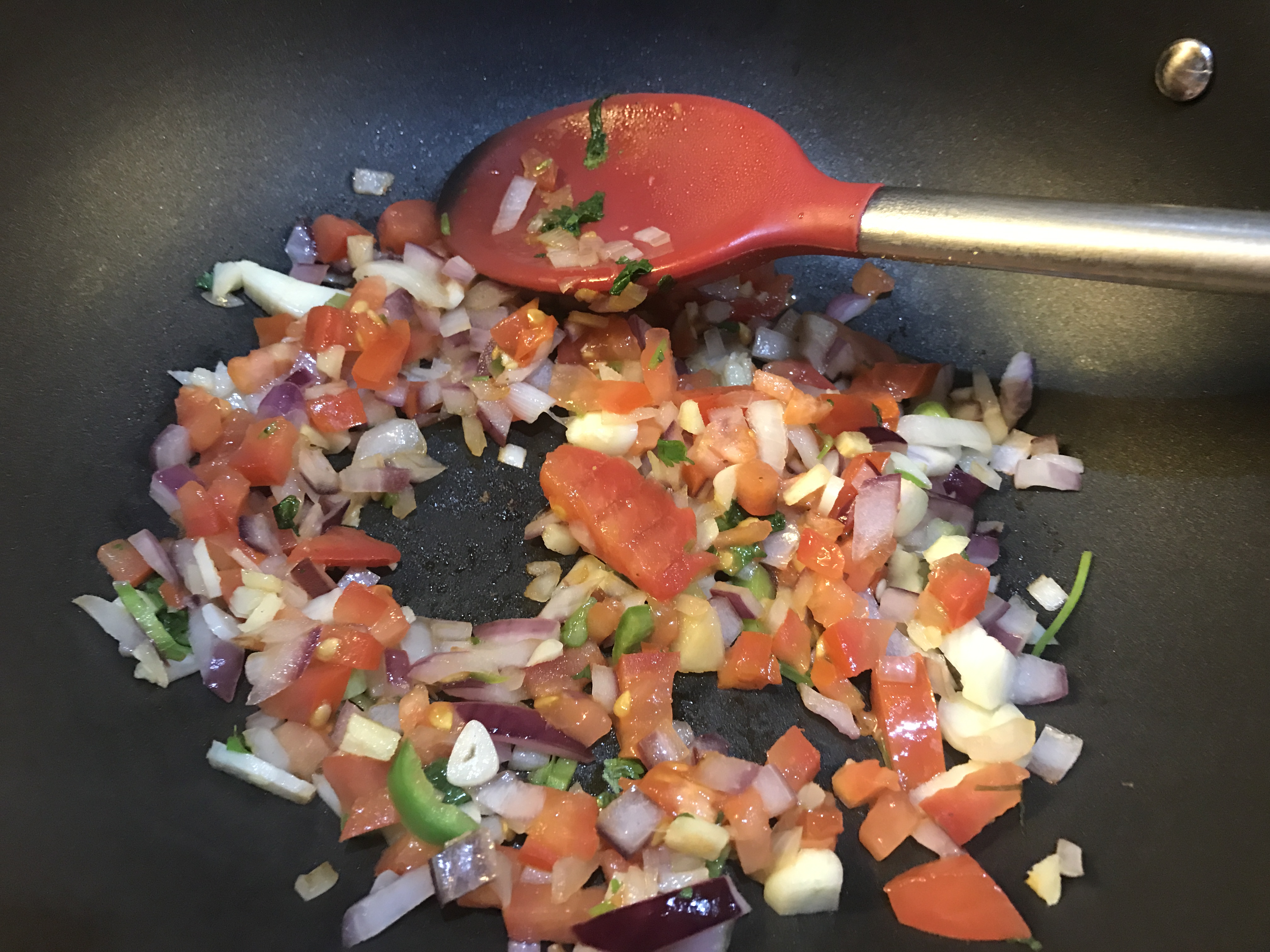 Drain and set aside in a colander. Heat oil in a Dutch oven or soup pot. Add asafoetida. Add the onions and sauté for 3-4 mins on medium heat, till translucent and turning pink. Add the ginger and garlic and sauté for a minute. Add tomatoes.