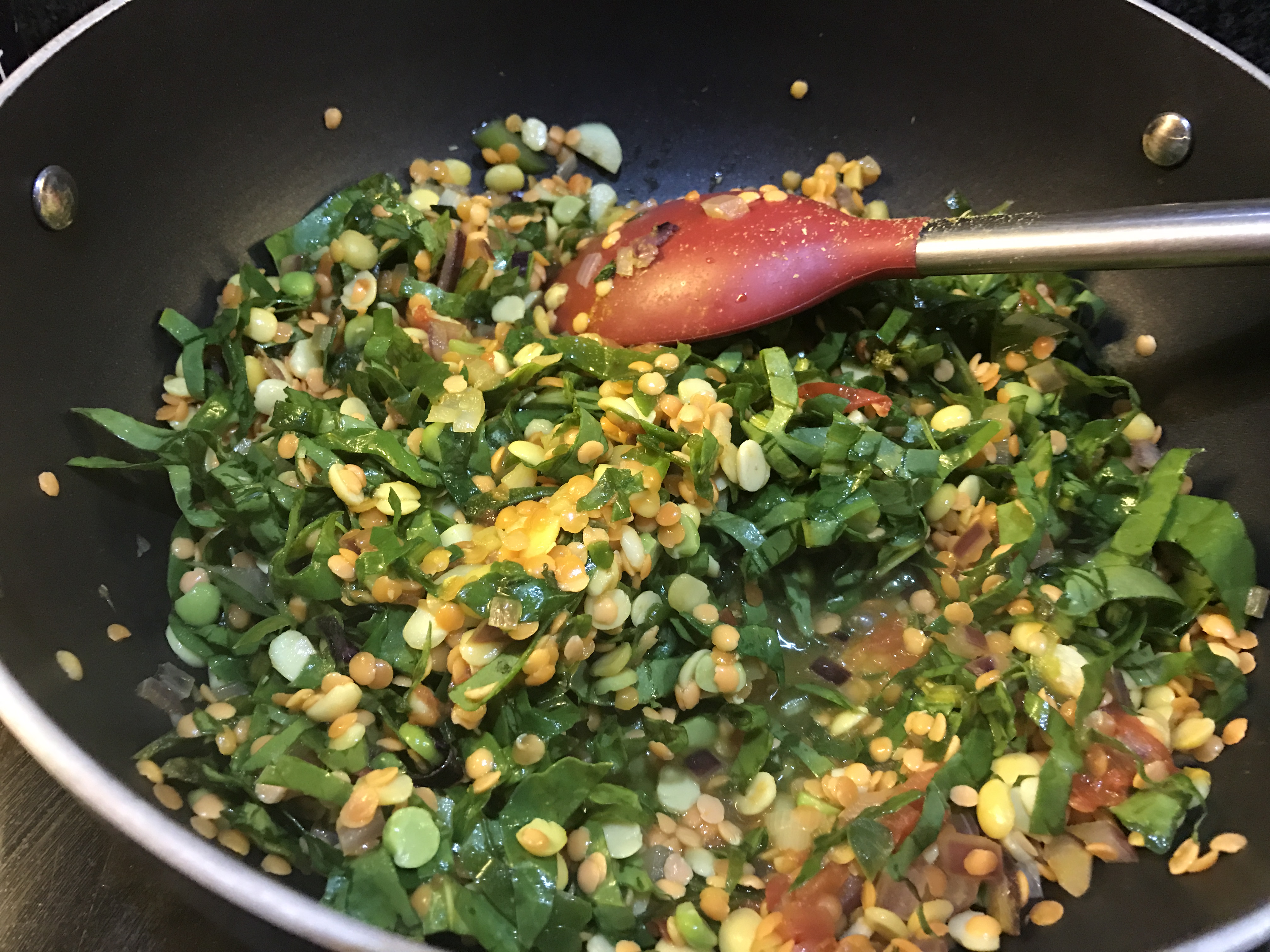 Add turmeric. Sauté for a minute and then add the lentils and the beet greens.