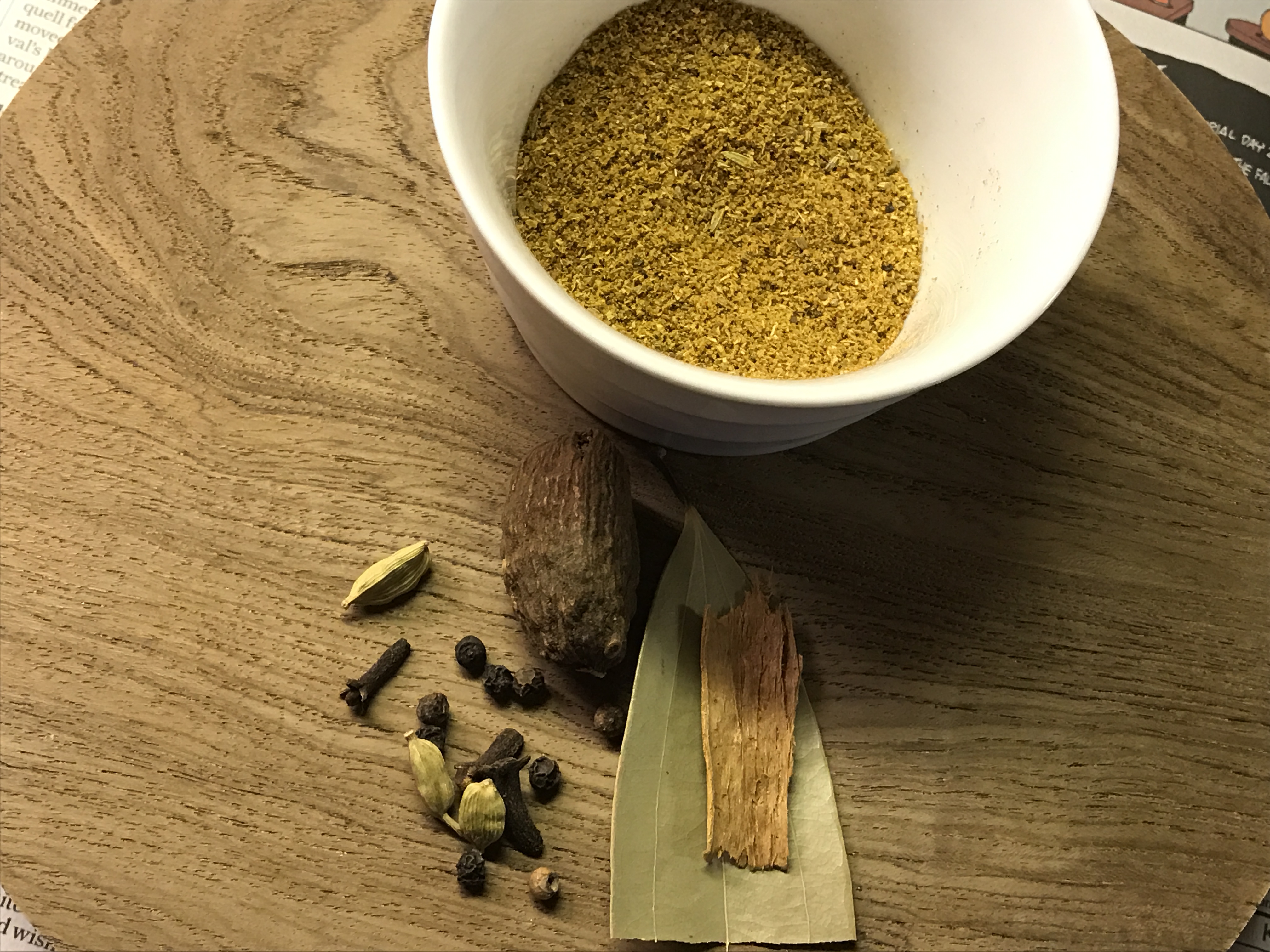 Whole spices or garam masala – 1 black cardamom, 3 green cardamoms, a few peppercorns, a cinnamon stick, 3 cloves, 1 bay leaf
