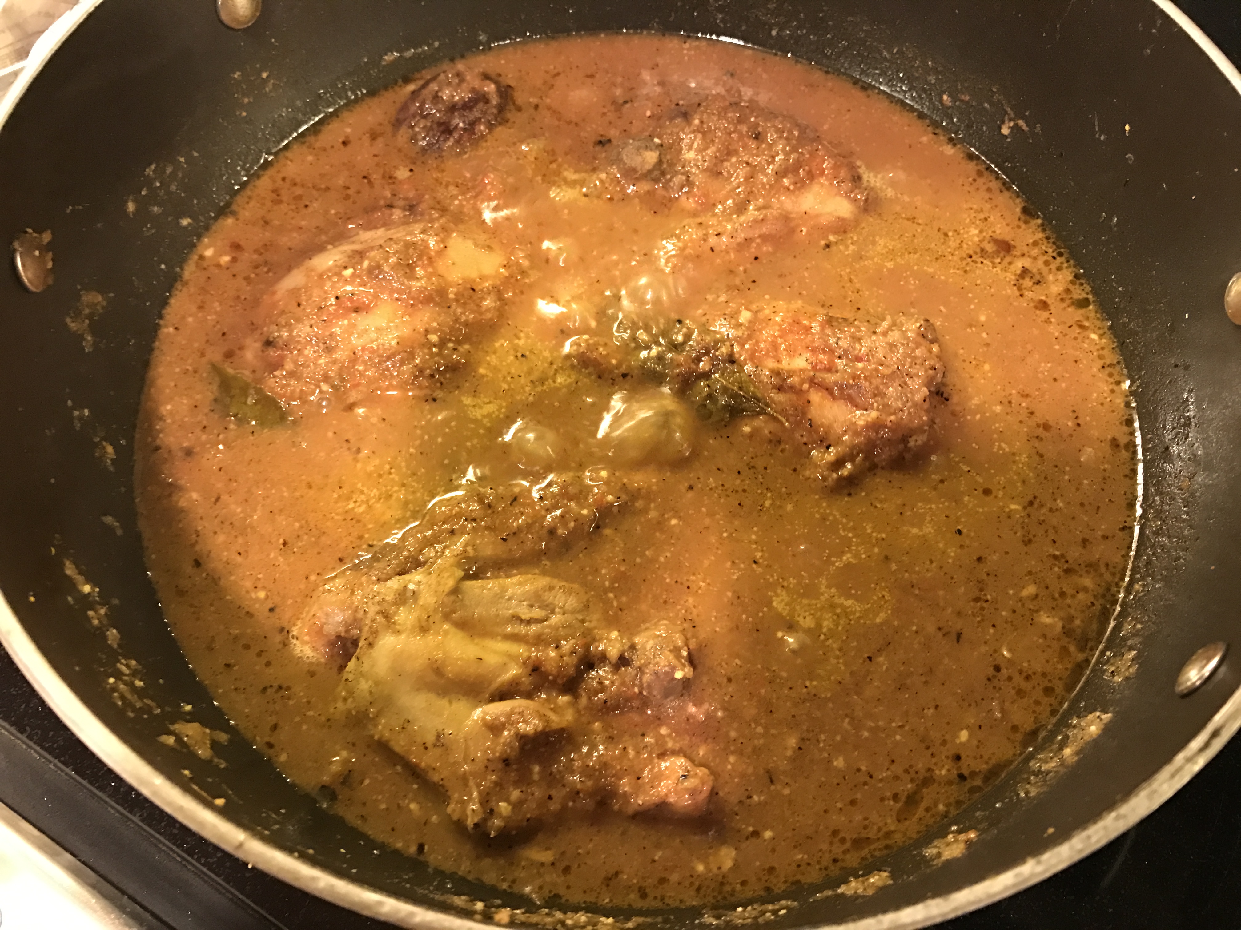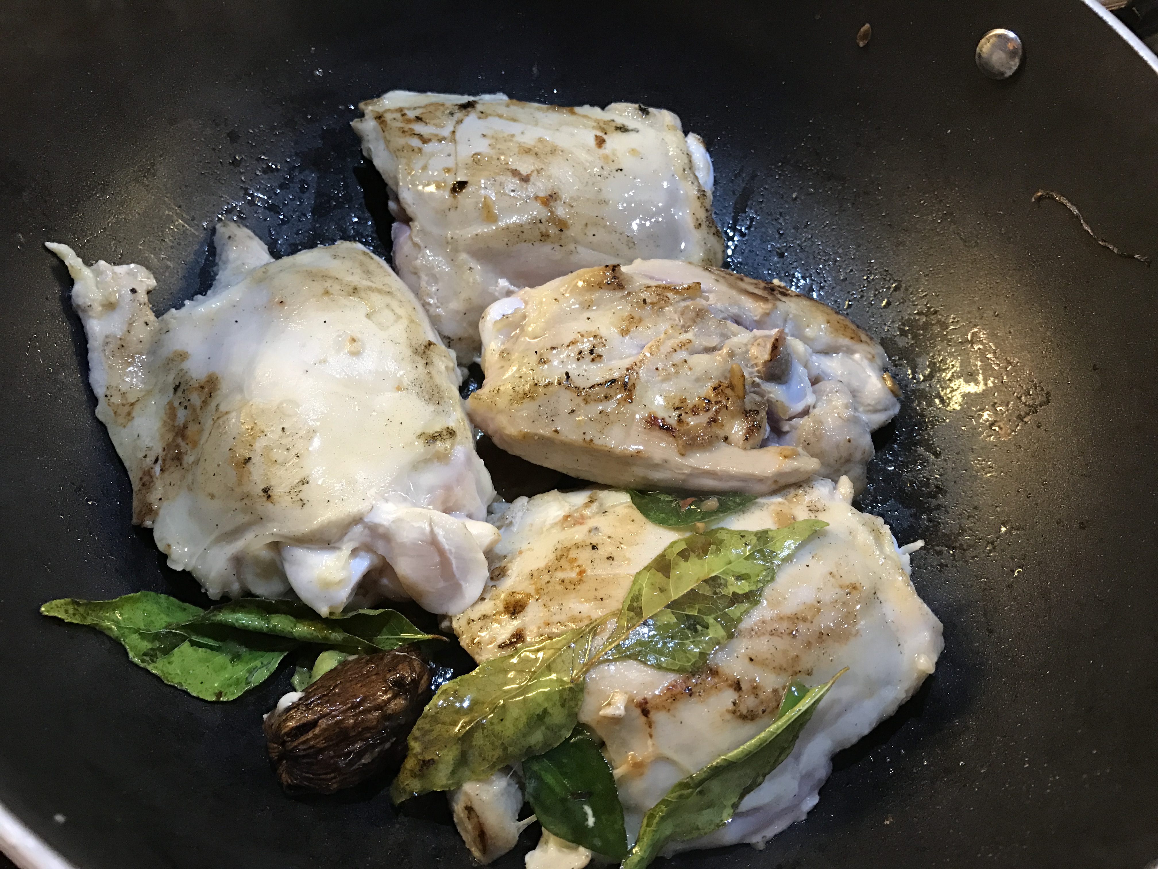 Heat a couple of tablespoons of olive oil in a deep bottomed pan. Add the whole garam masala. Add the chicken pieces and fry on medium high heat for a few minutes till it develops a light golden color. Add the curry leaves, green chillies, ginger and garlic and sauté for a minute.
