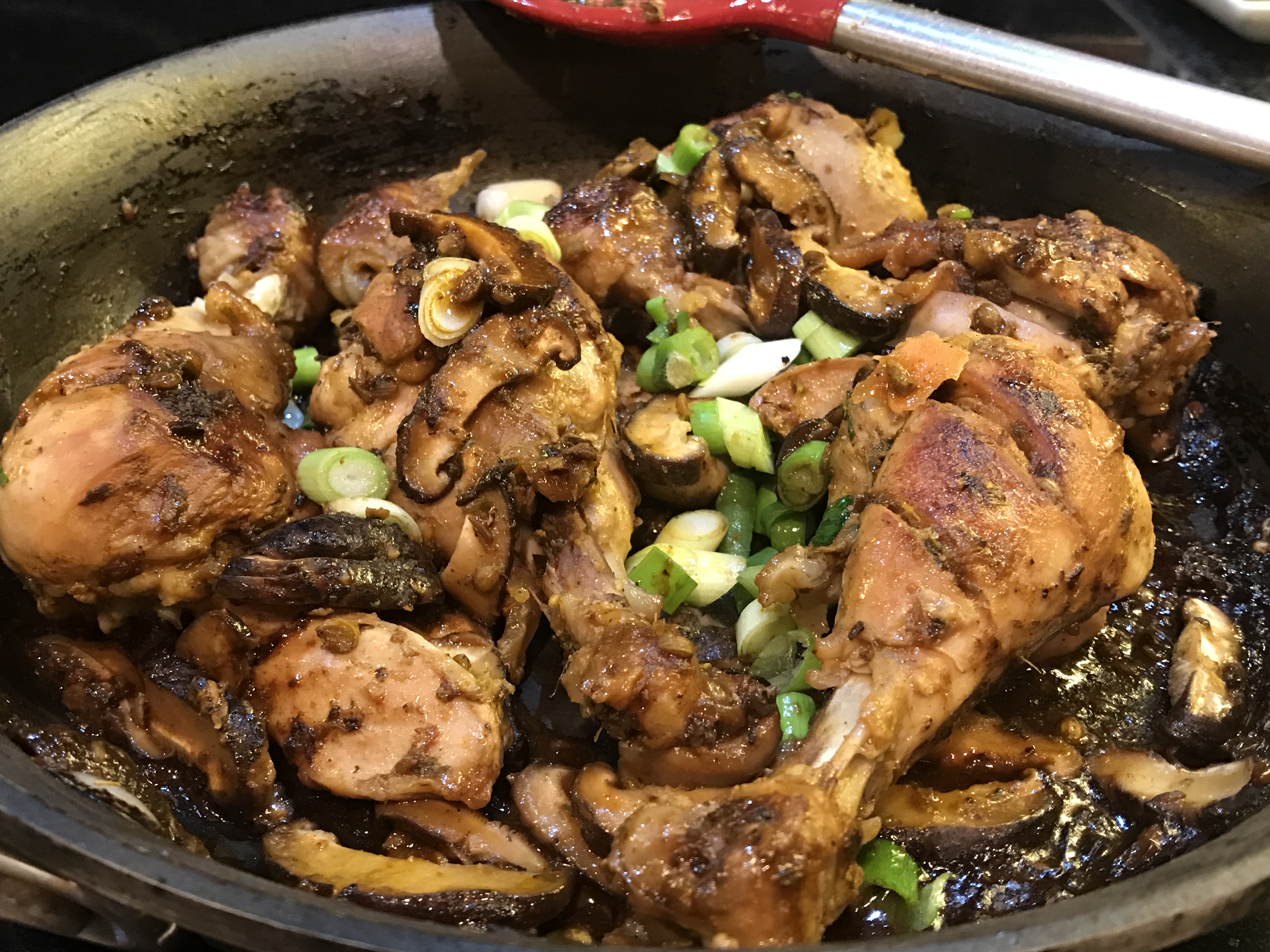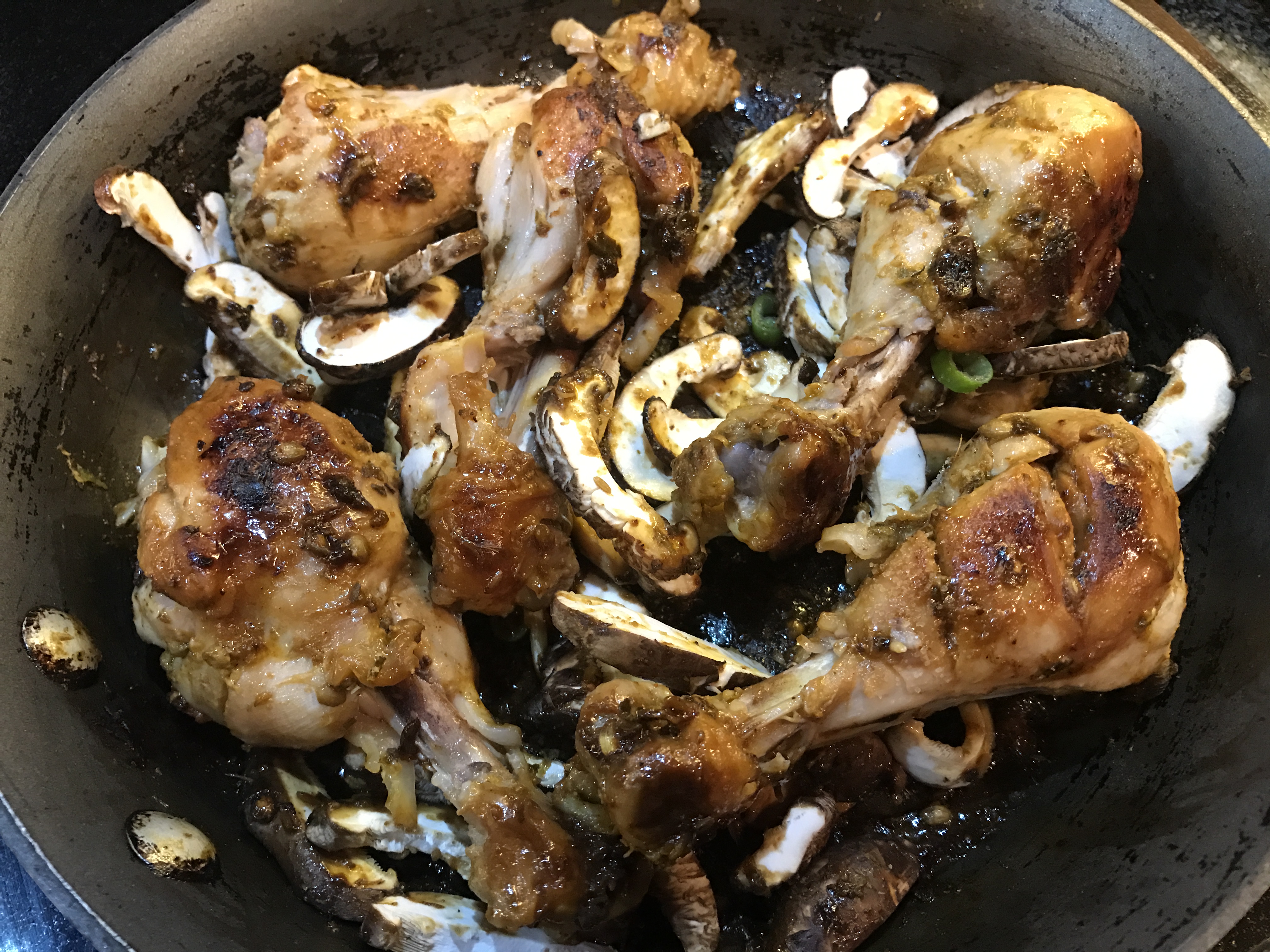 Chicken legs or drumsticks, marinated in a flavorful paste of spices and herbs, pan-grilled with shiitake mushrooms, green onions and a final flourish of Bourbon.