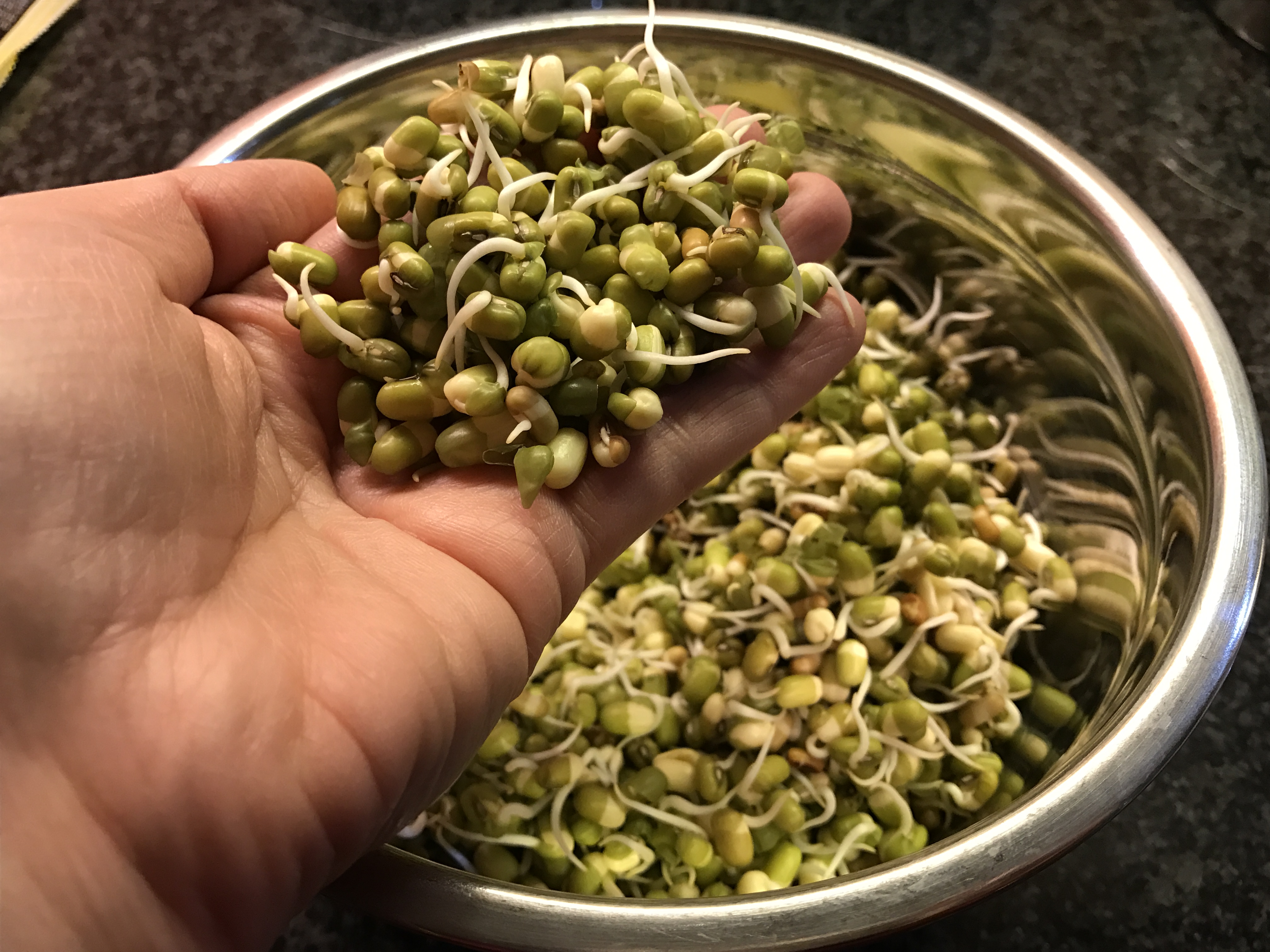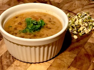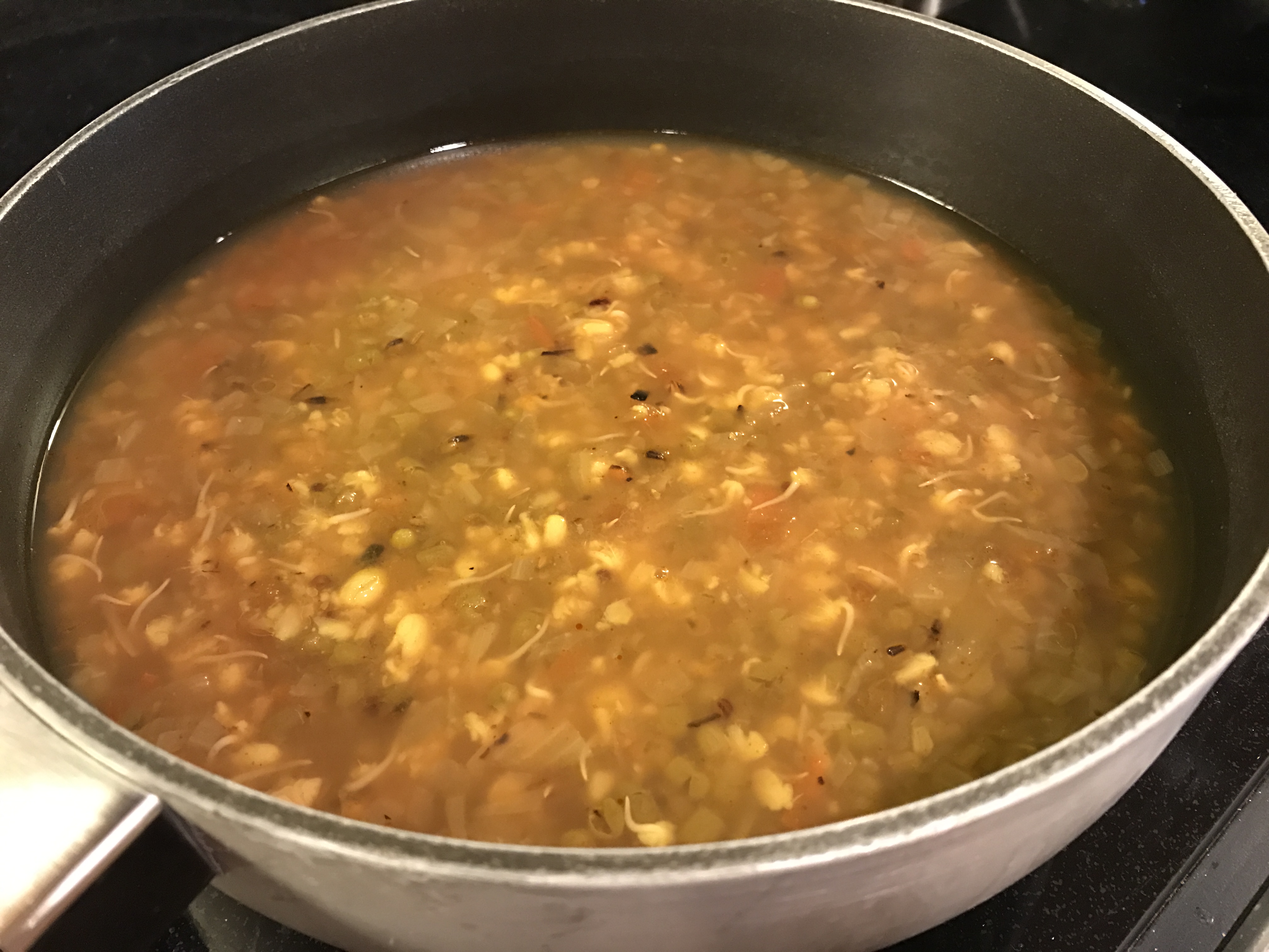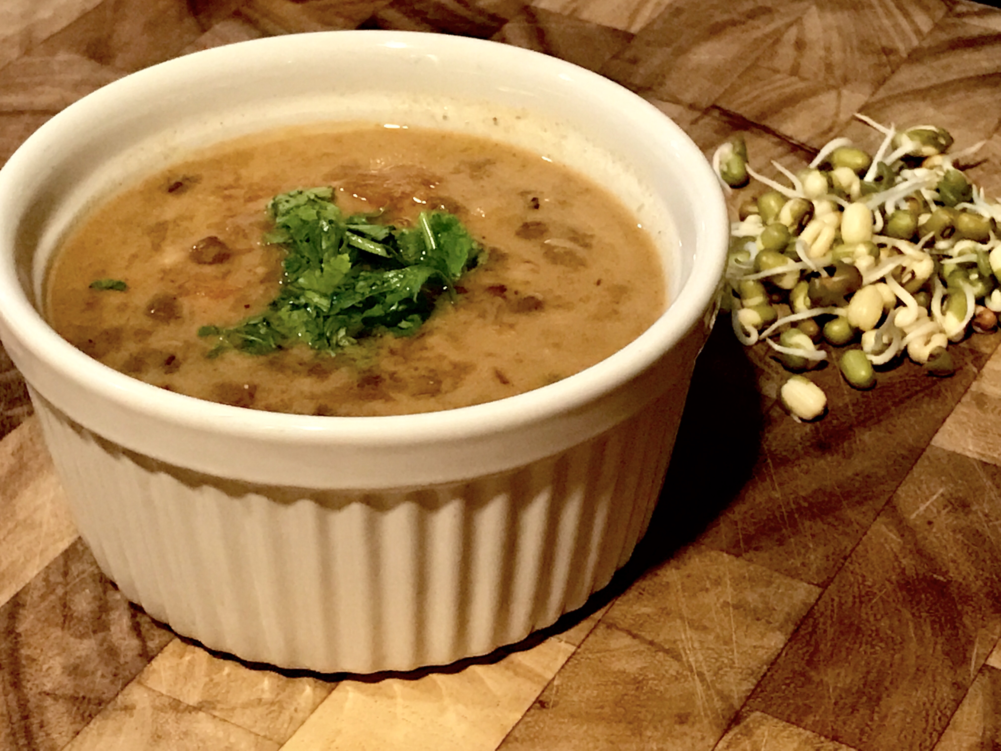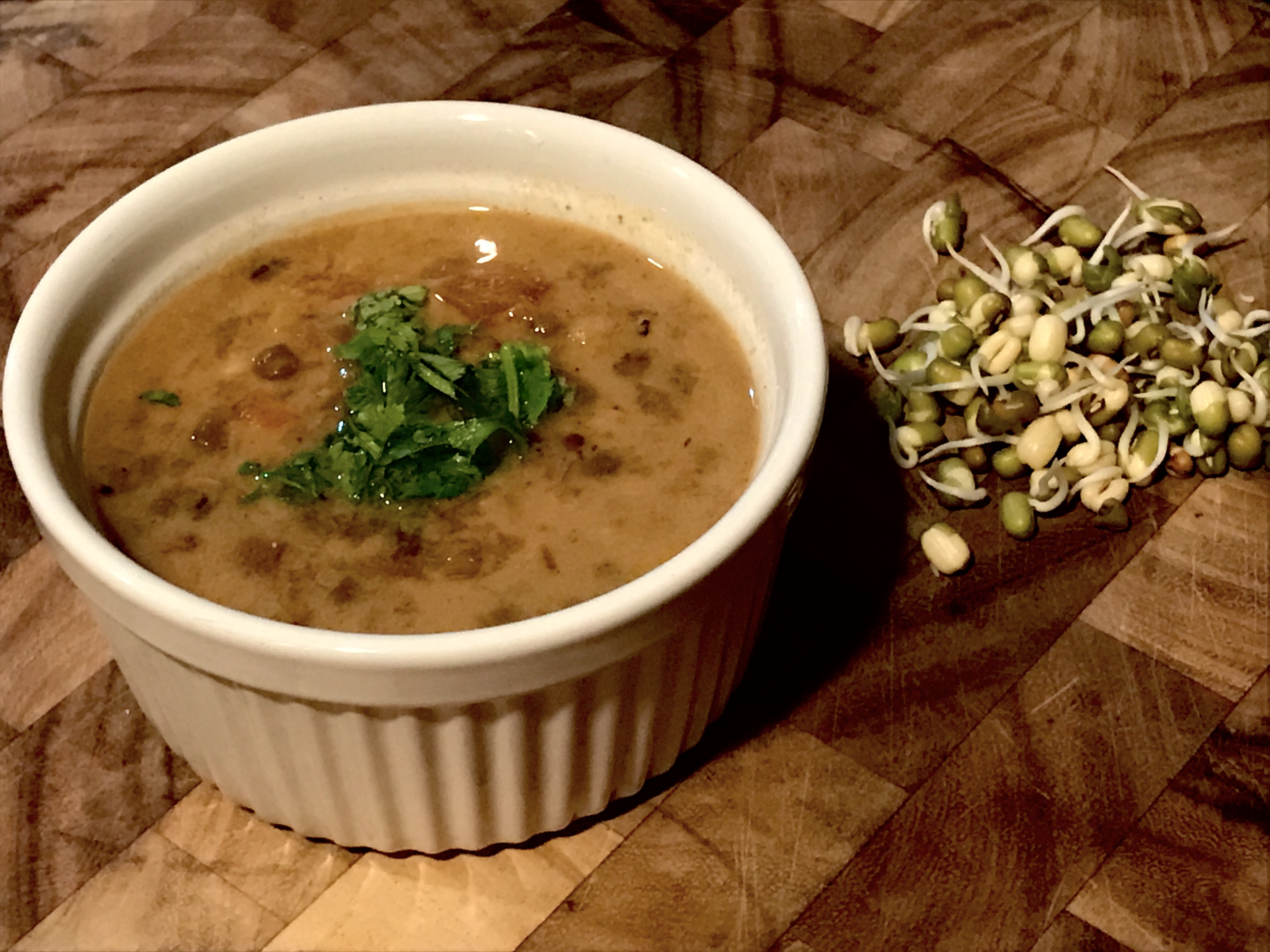 Sprouted green mung beans, simmered in a curry with coconut milk, cardamoms, onions, ginger, garlic, tomatoes and spices. Similar to daal or a soup. Vegetarian and gluten-free.