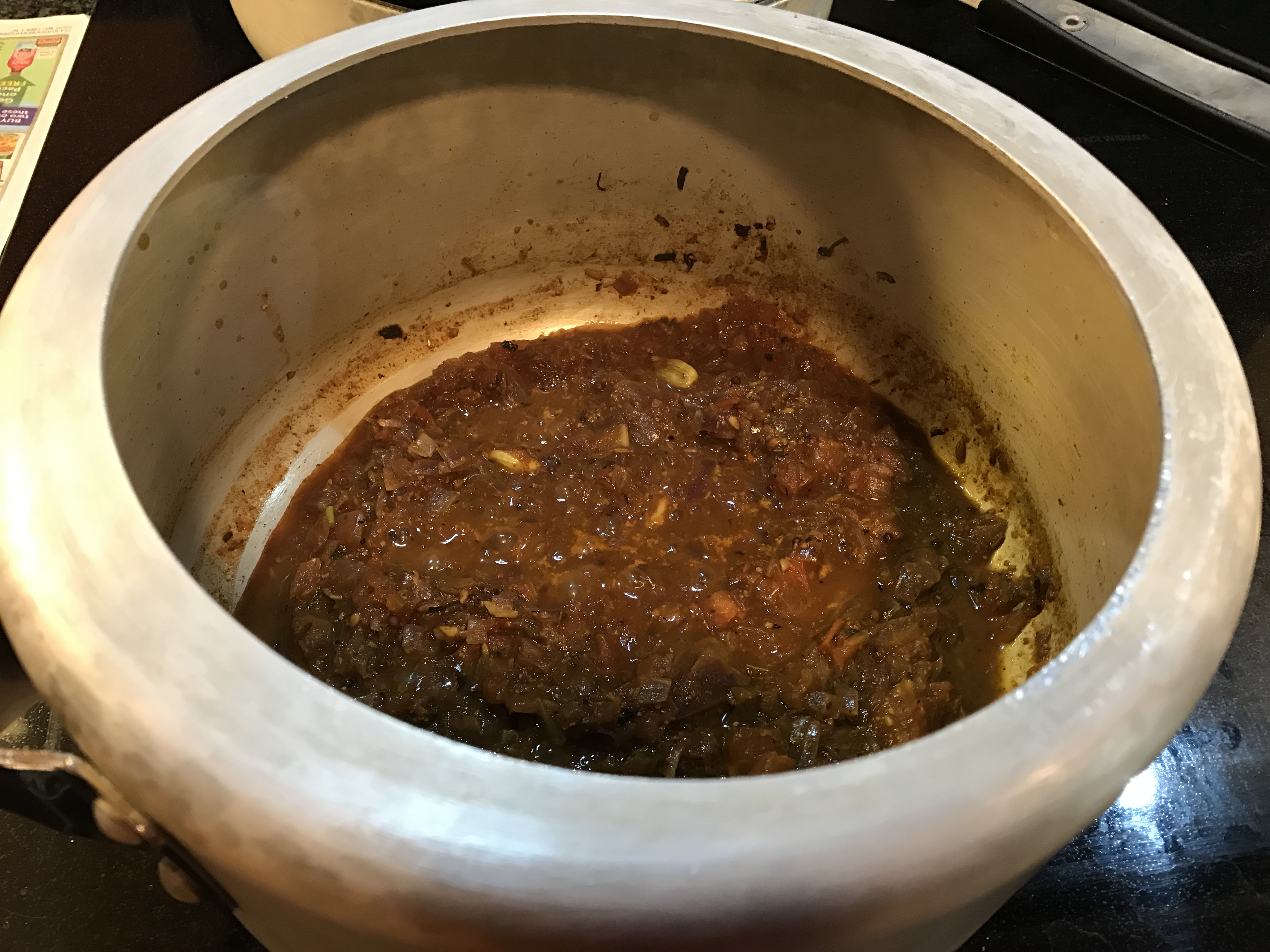 In a large pressure cooker, add ghee. (I use my traditional, old school stove-top, made-in-India pressure cooker :-)). Sauté the onions over low to medium heat till caramelised and golden brown. Add the ginger-garlic spice paste. Add the curry leaves, mustard seeds and cumin seeds. Sauté for a minute. Add the ground spice mix along with a little water, so that they don’t burn. Sauté for a couple of minutes. Add tomatoes and a couple tablespoons water and simmer on low for 8-10 minutes.