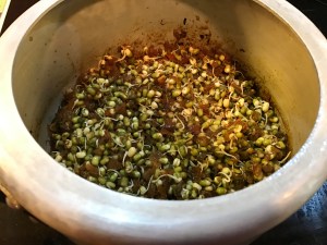 I started out by sprouting mung beans or green gram, as it is also called. I sprouted a big batch, kind of double duty cooking for the week. The remaining sprouts, I added to a fresh salad the next day, the recipe to feature in my next blog post. The healthiest way to eat sprouts would be raw or slightly steamed, to retain the nutrition and crunch. I took another route by steaming them in the pressure cooker along with the basic 4’s that go into most curries and deals – onions, tomatoes, ginger, garlic. Of course, it would be incomplete and lacking flavour, without the addition of some fragrant whole spices and ground masalas from my spice box or ‘masaldaani’ as I like to call it. The twist, which really gave it, that exciting kick, is coconut milk, along with curry leaves, mustard seeds, white poppy seeds, cardamoms and powdered fennel seeds. It also lent a regional Indian touch to the dish, reminiscent of a coastal Kerala curry. A sprinkle of fresh cilantro and a dash of freshly squeezed lemon juice, livens up any lentil dish, before you bring it to your dining table to be devoured 🙂