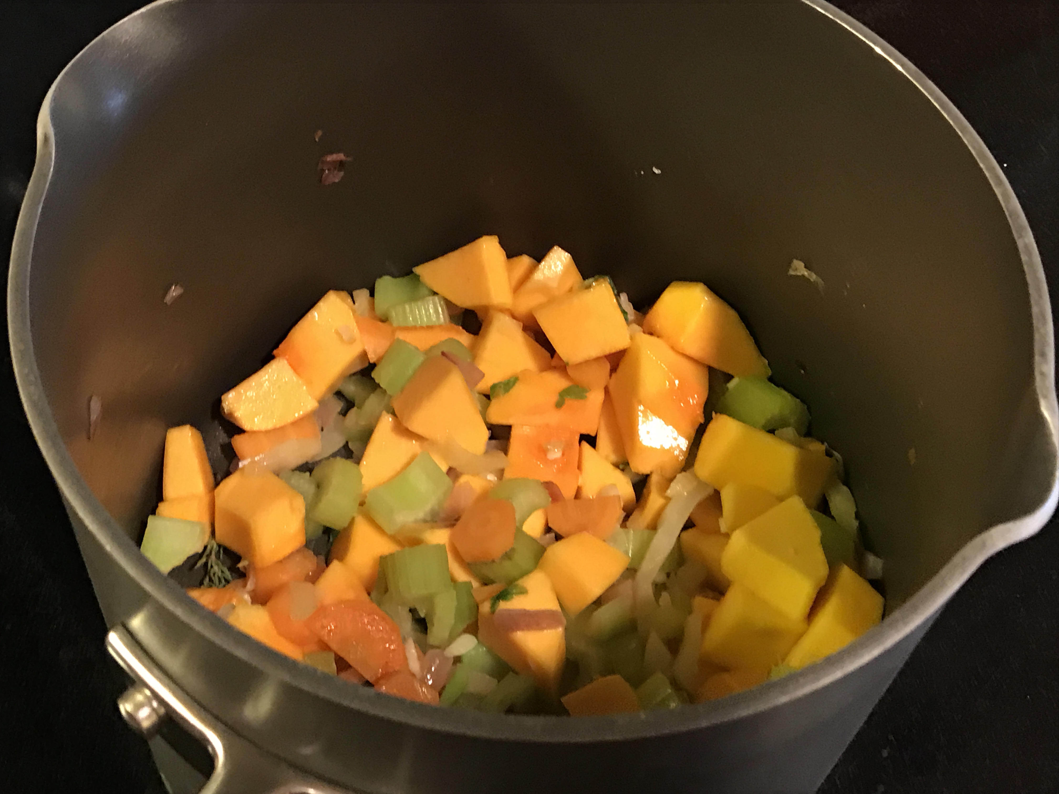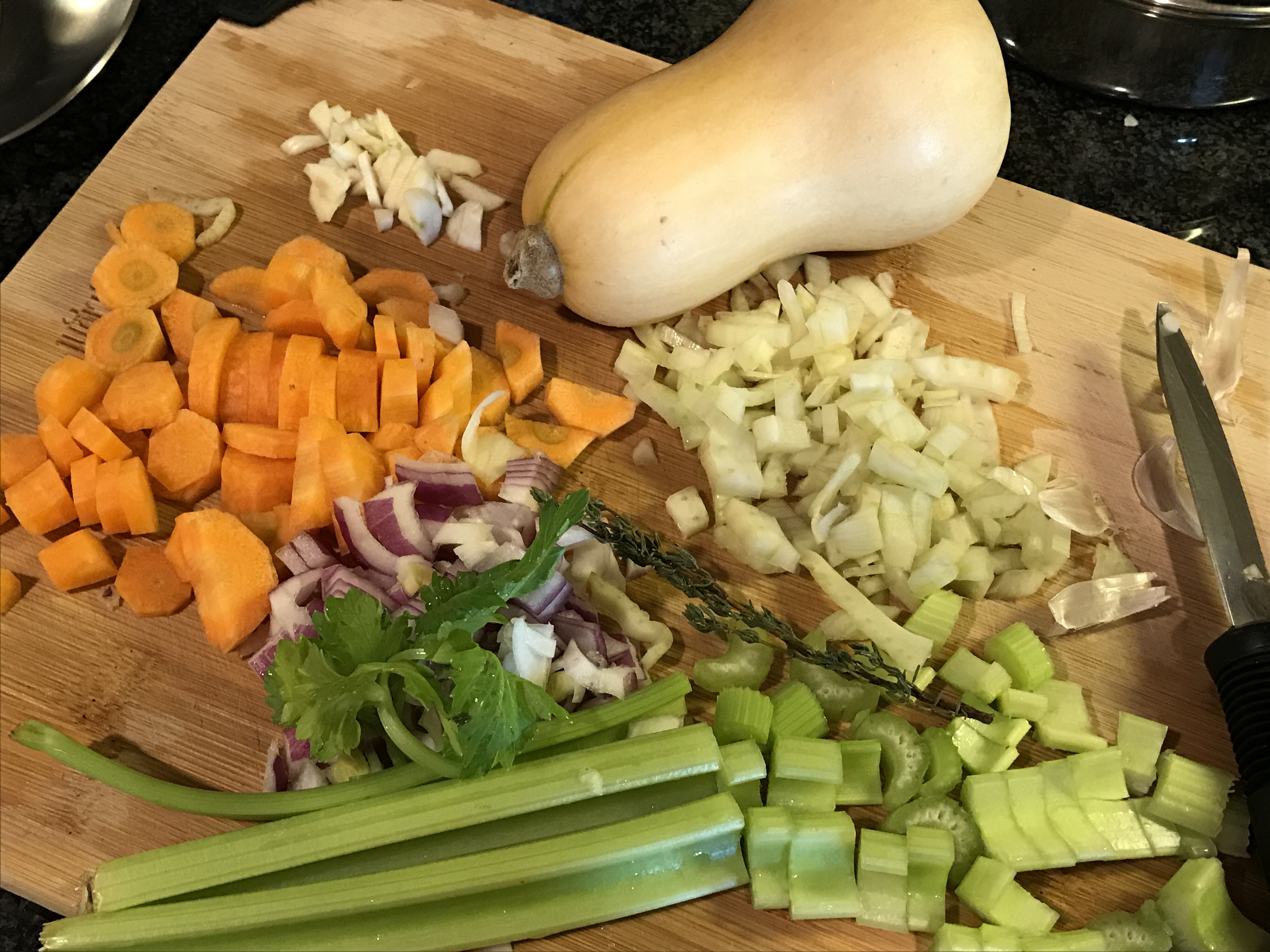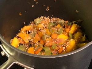 In a large soup pot or Dutch oven, heat olive oil. Add the onions, carrots, celery and fennel. Sauté on medium low heat for a few minutes, till veggies start sweating, add a little salt in between. Add the thyme and garlic. Add the squash.