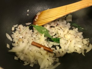 In a large pan, heat oil. Add the whole spices – cloves, green cardamoms, cinnamon, peppercorns. Add the cumin and mustard seeds. Add the curry leaves. Add onions and sauté for 5-8 minutes on medium to medium-high heat till onions start turning pink to a pale light brown.