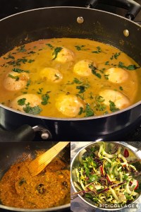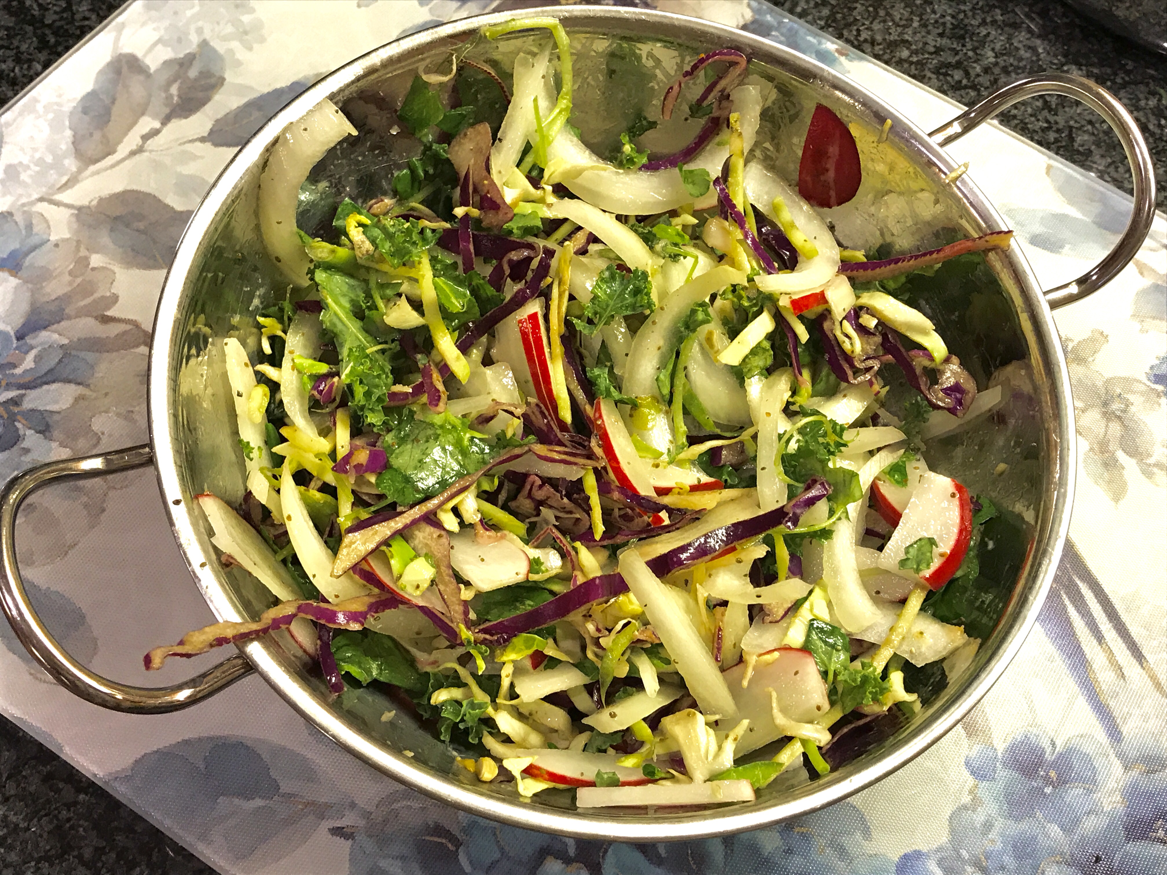 A mix of fresh purple and green cabbages, red radishes, kale, onions and watercress. Also, shaved brussel sprouts, if you can lay your hands on them. Tossed together in a light and refreshing vinaigrette with extra virgin olive oil, lemon juice, apple cider vinegar, raw honey and tahini. It serves as a perfect compliment to the curry. A fresh and cooling salad to balance the delicious and complex curry, the curry though made with simple ingredients found in many a kitchen in Indian homes.