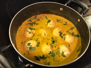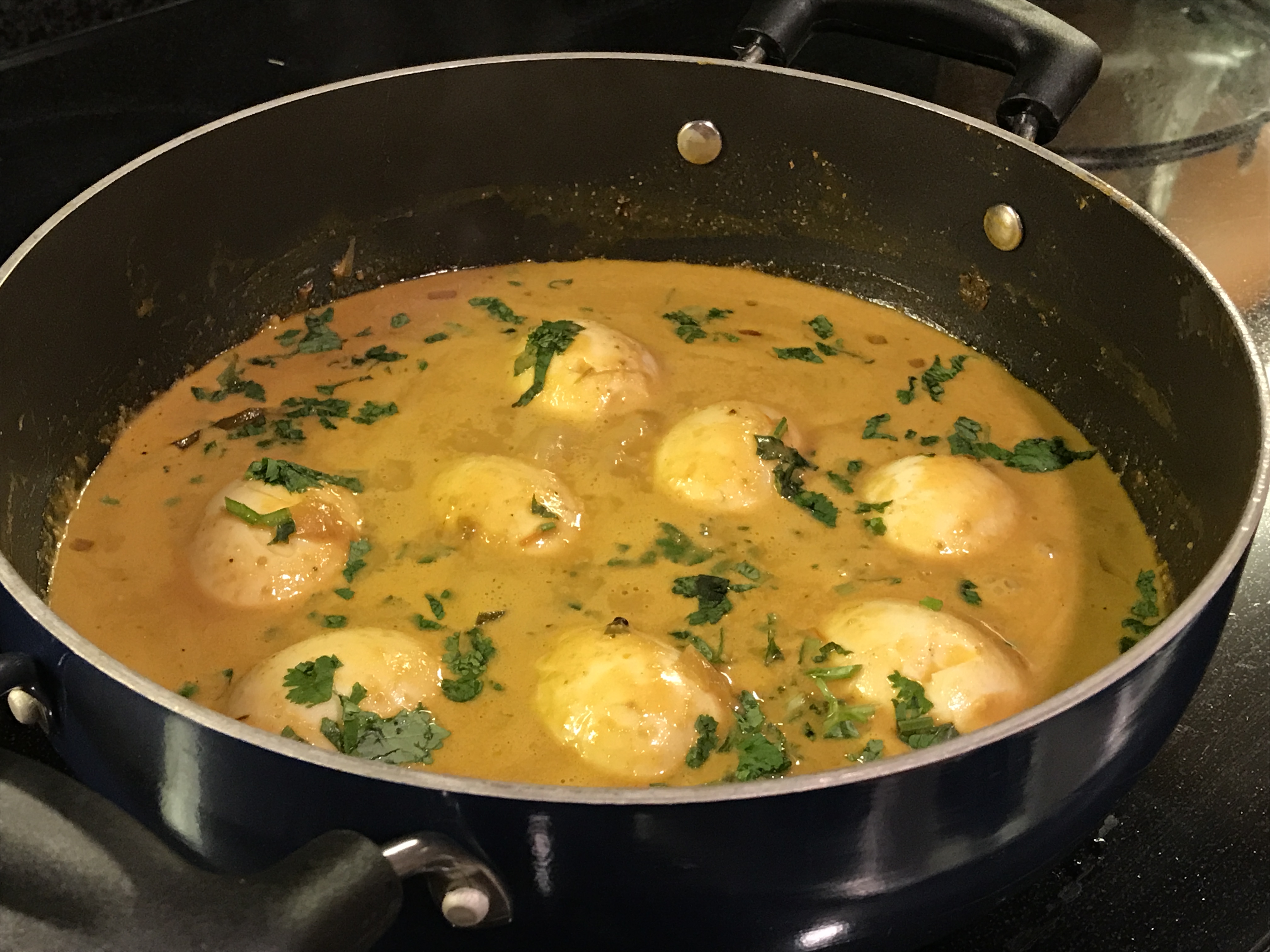 A coconut based curry from the coastal region of Kerala in India. Eggs simmered in a curry made with coconut milk and cashew nuts, with plenty of aromatic spices, onions, tomatoes, ginger, garlic, curry leaves, chillies and kokum.