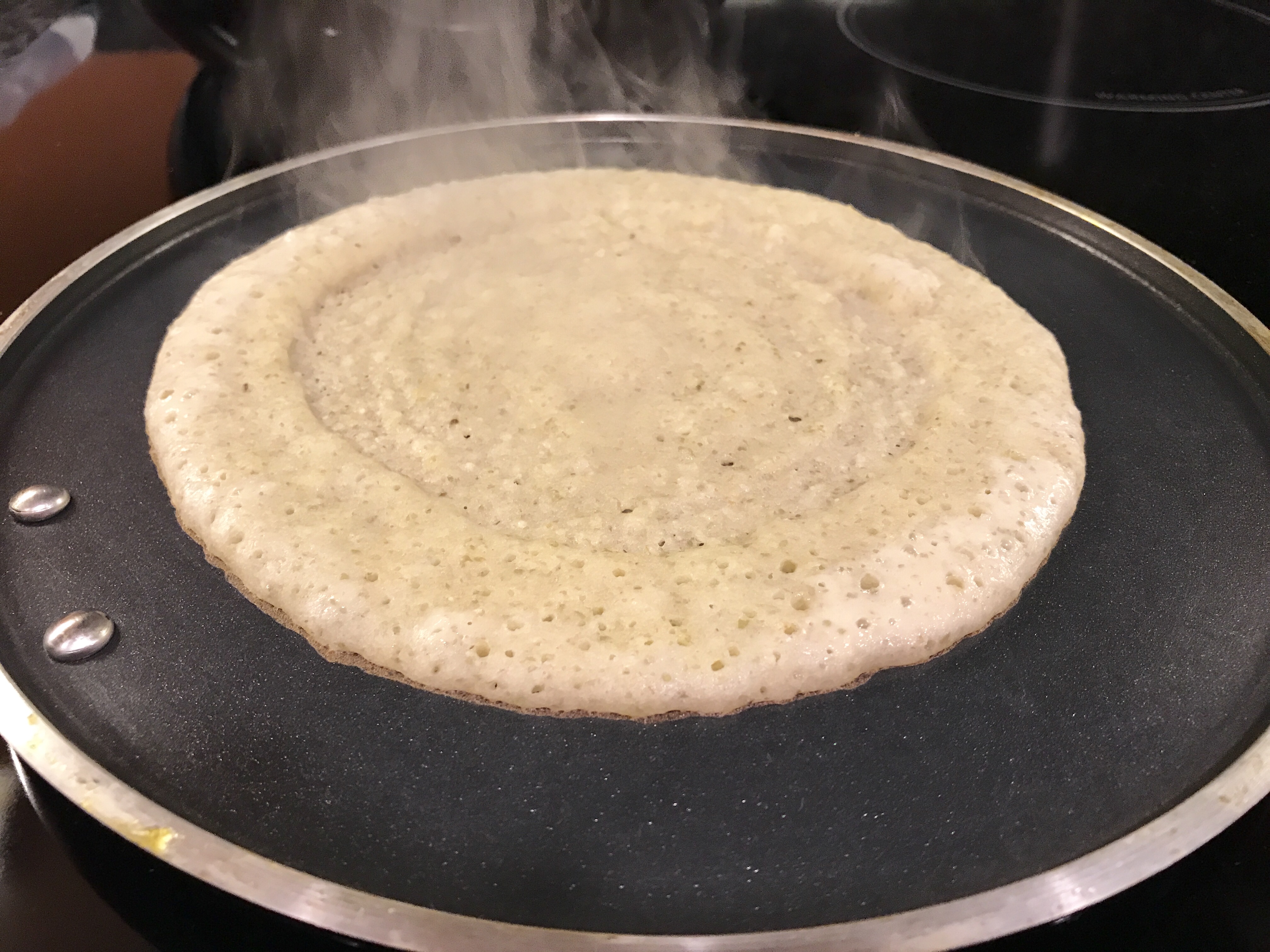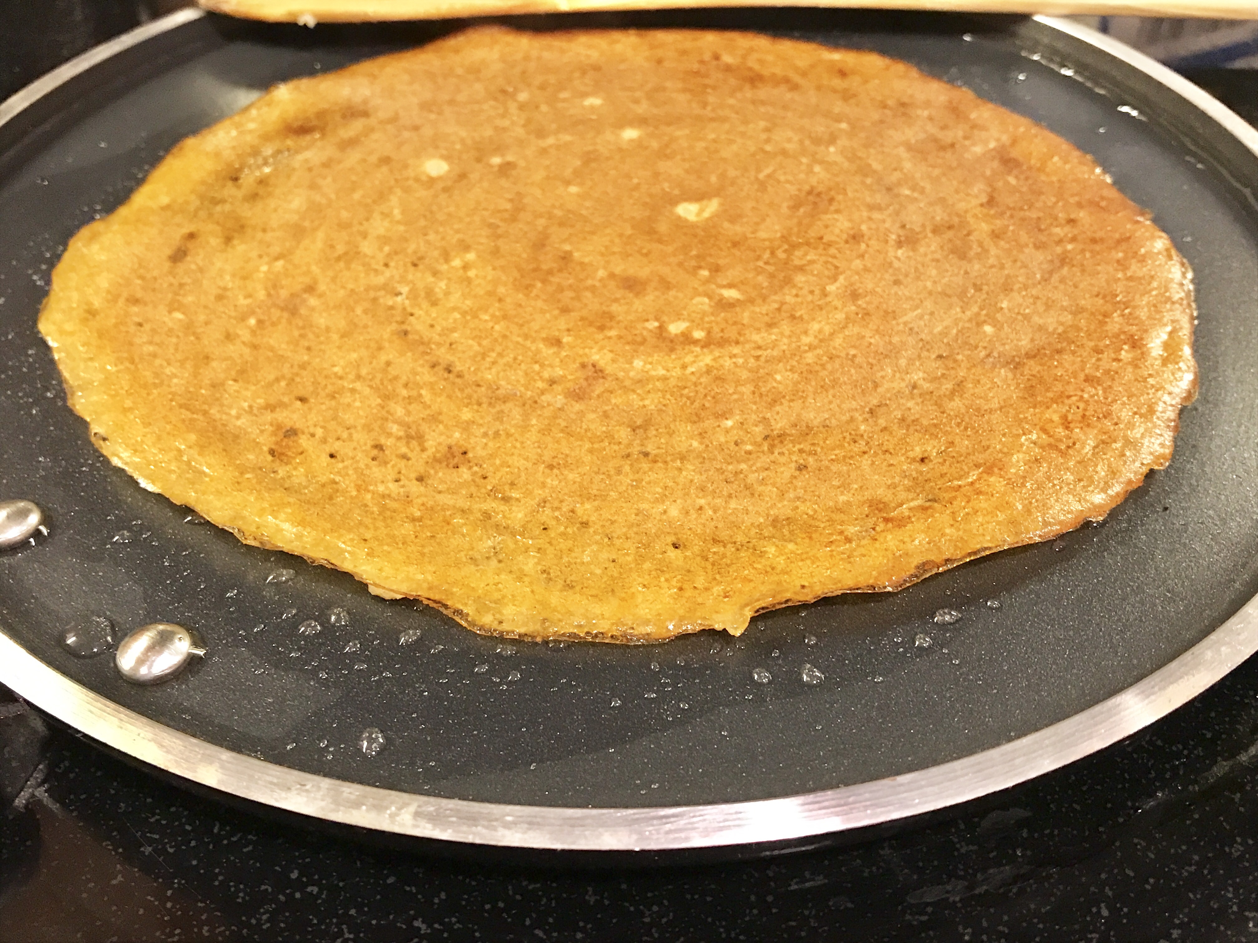 Lower heat to medium low. Pour a little oil around the edges. When the dosa starts turning light brown, flip it over to the other side and cook for a couple more minutes.