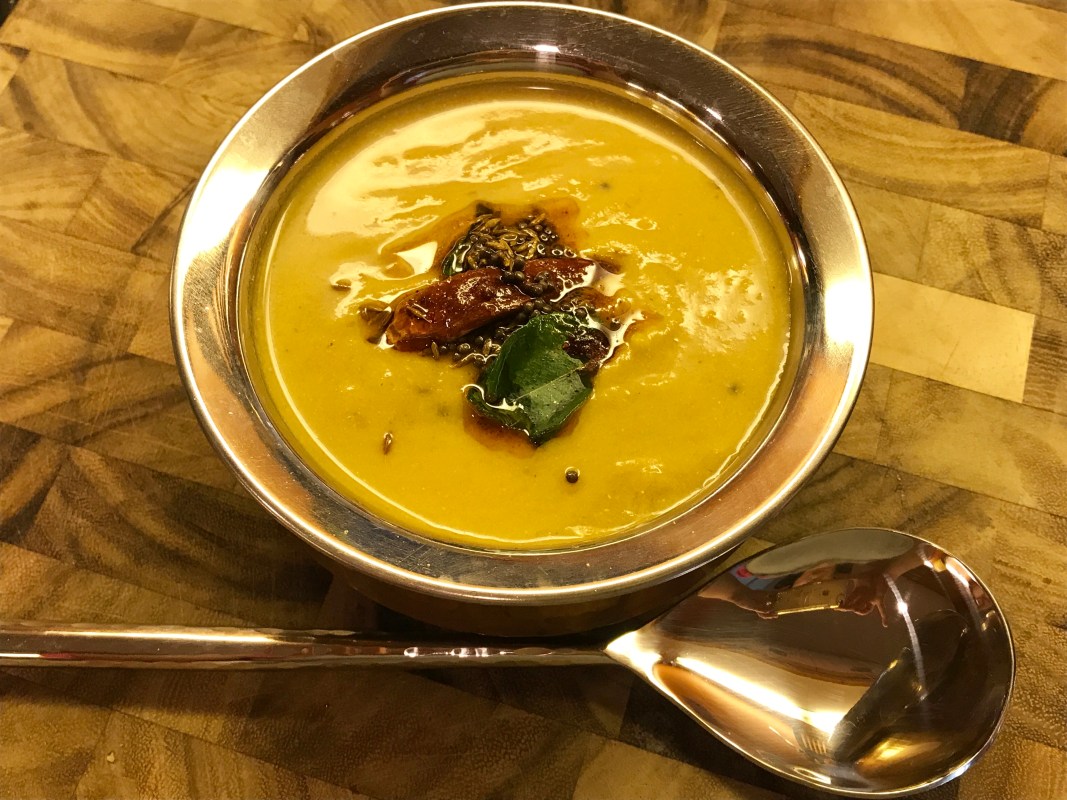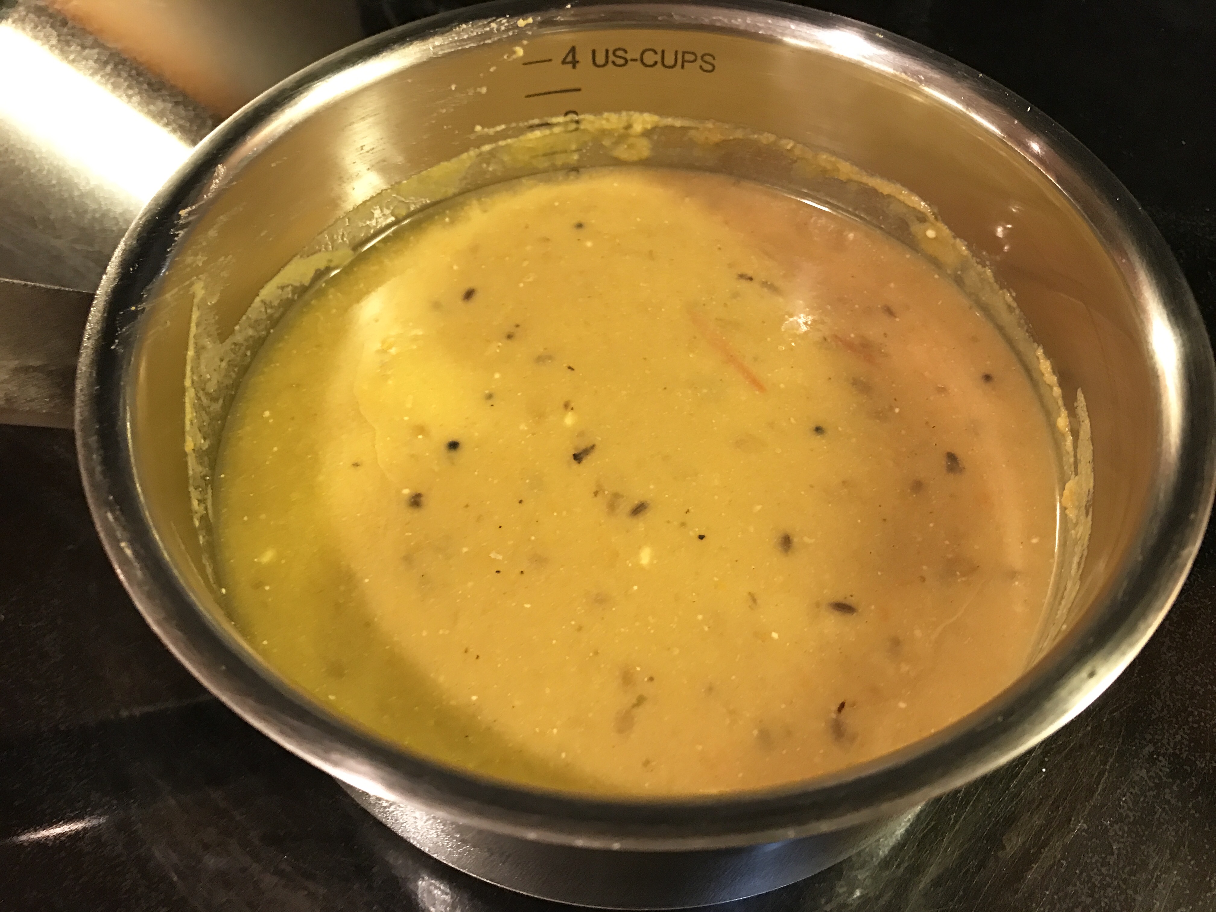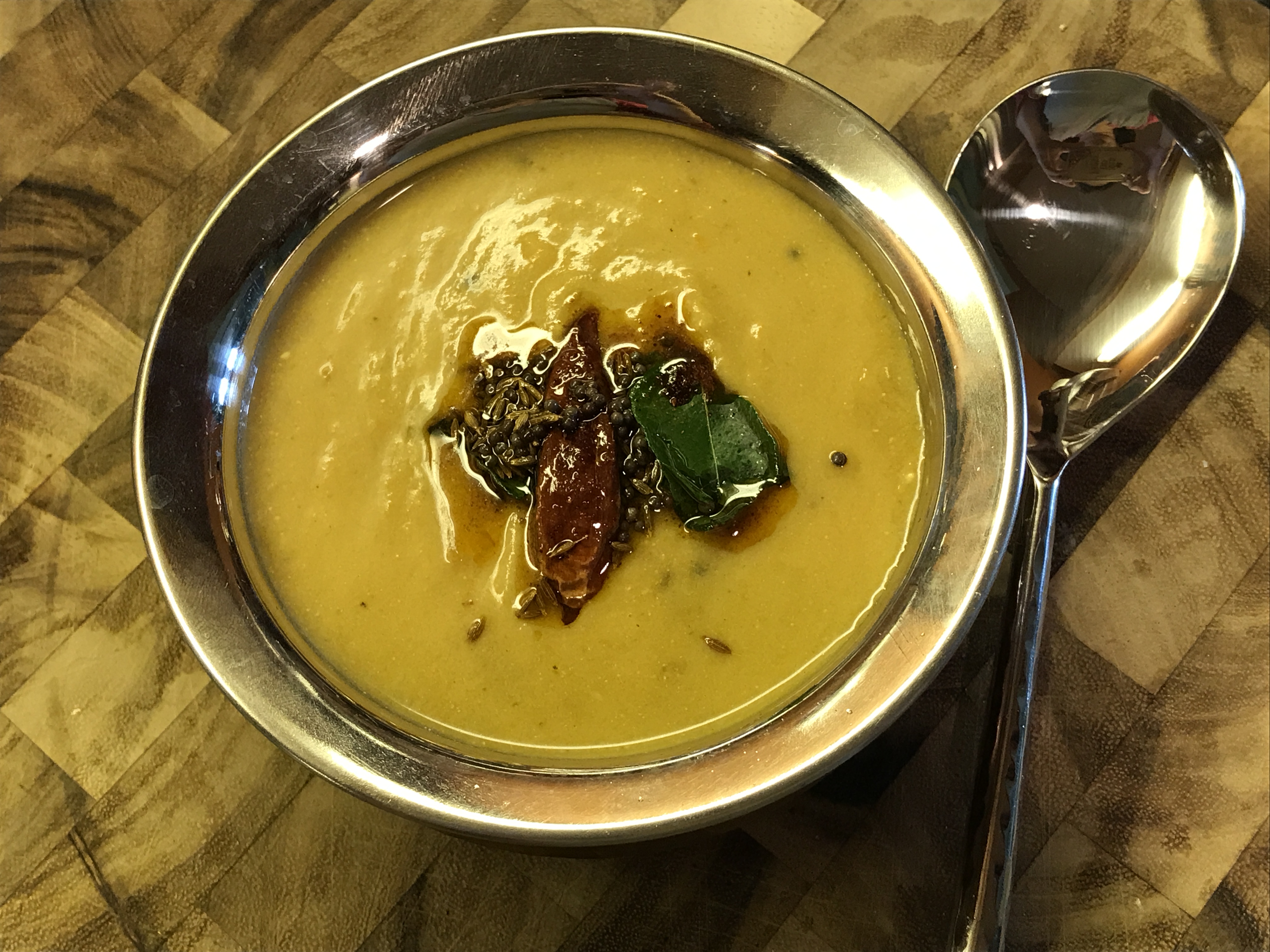 With an immersion blender, blend the dal to a purée. Add coconut milk and stir well. Add salt to taste. Before serving, add the tarka or tempering :