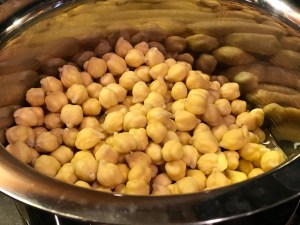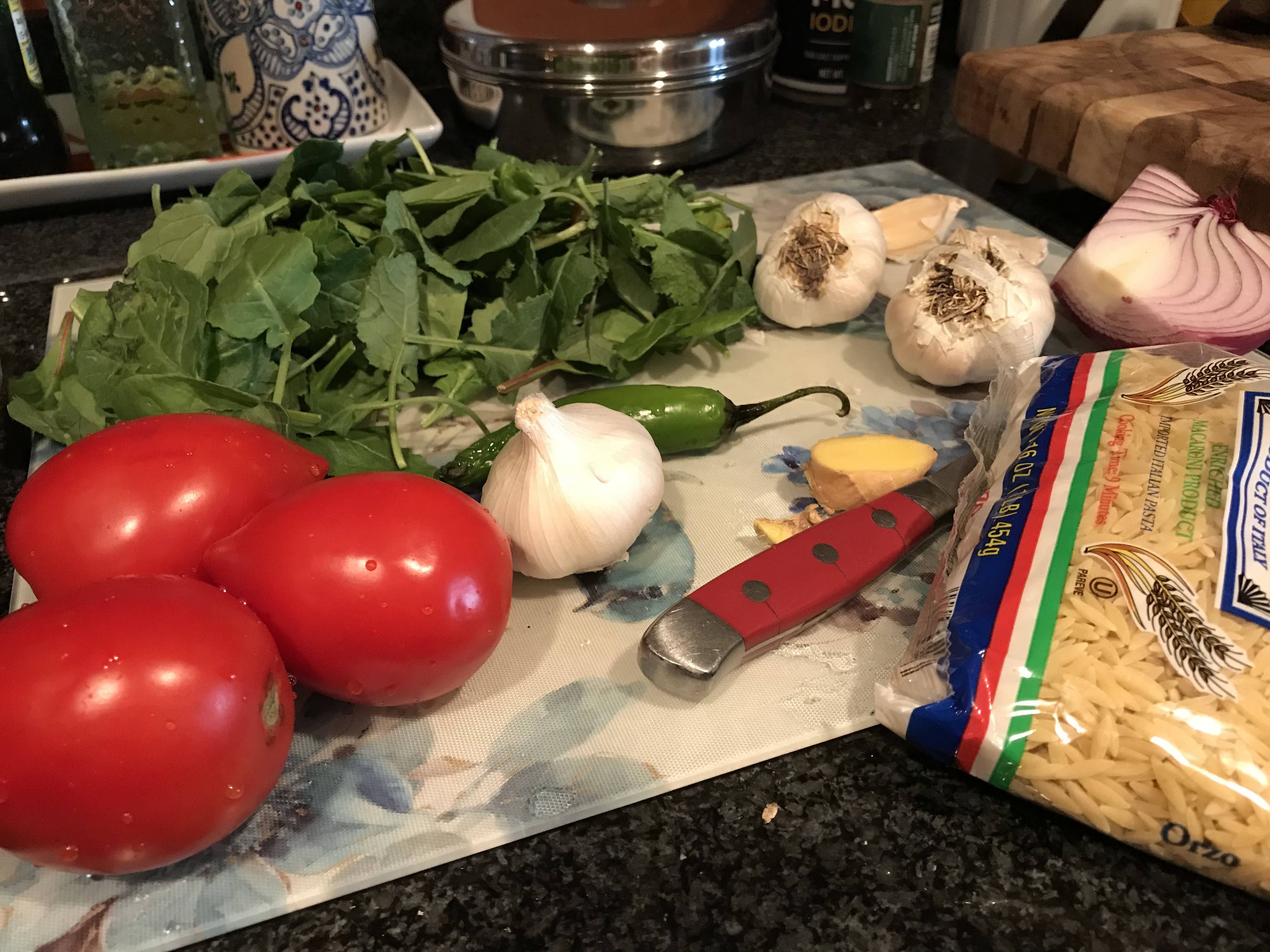 If we were to eat this in the traditional Indian way, as we eat in our homes, it would be channa (or chhole) masala and rice. I nostalgically call it channa curry, which I grew up eating in India, one of my mom’s best curries. In this recipe, the chickpeas are not floating in a curry, but are more on the dry side, definitely loaded with the customary spices and masalas, and plenty of tomatoes, onions, ginger and garlic. The souring agent is tamarind. And the accompaniment is not rice, but orzo, which is pasta shaped like rice.