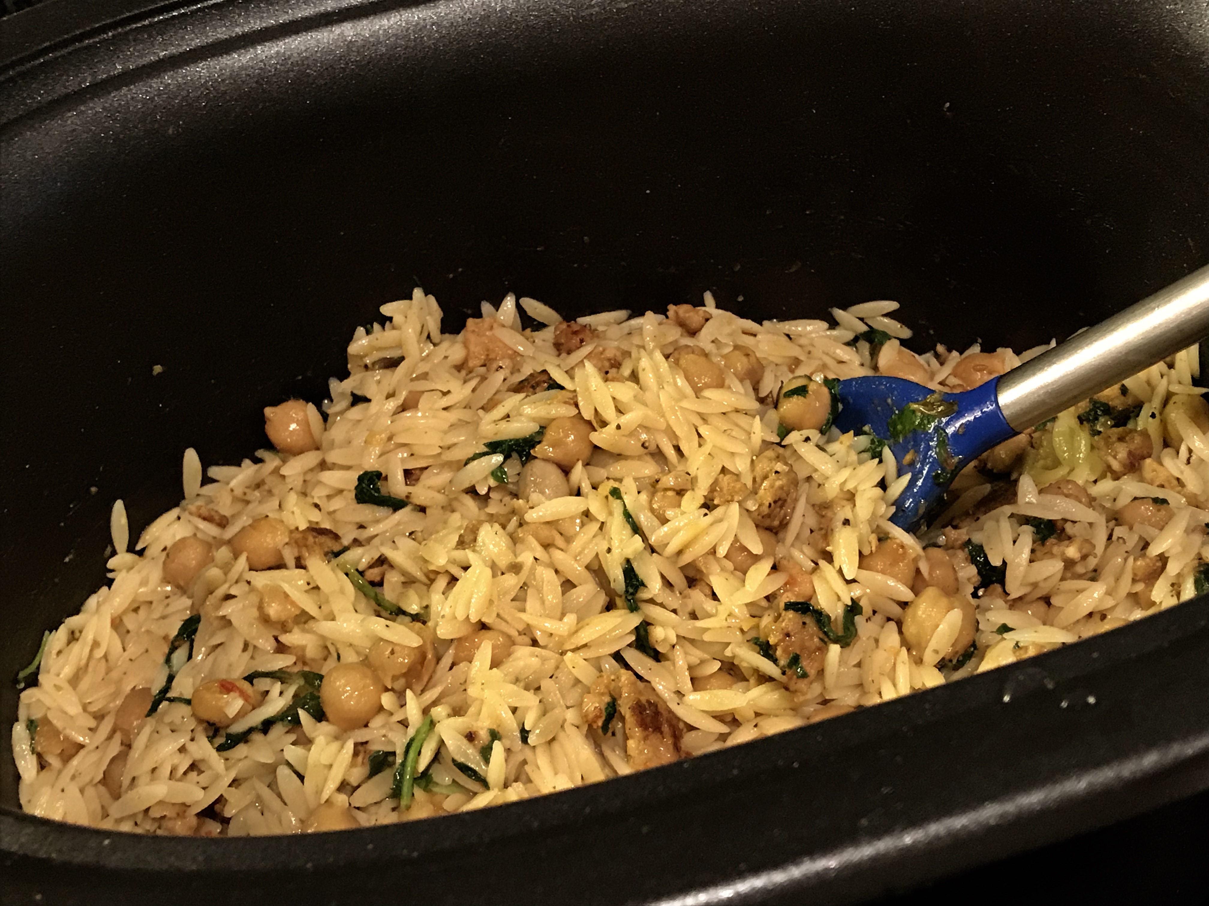 Orzo pasta, with spiced chickpeas or chana masala, Italian chicken sausage and kale.