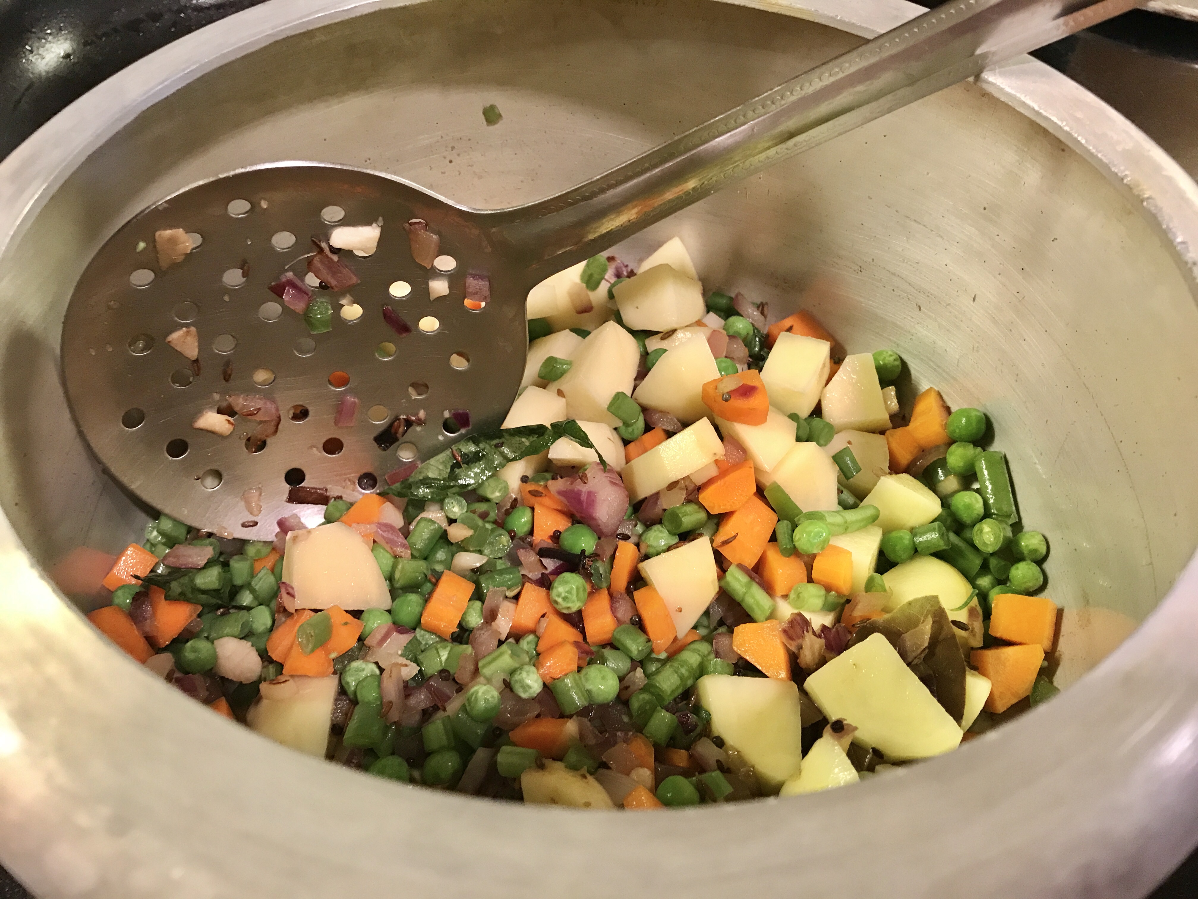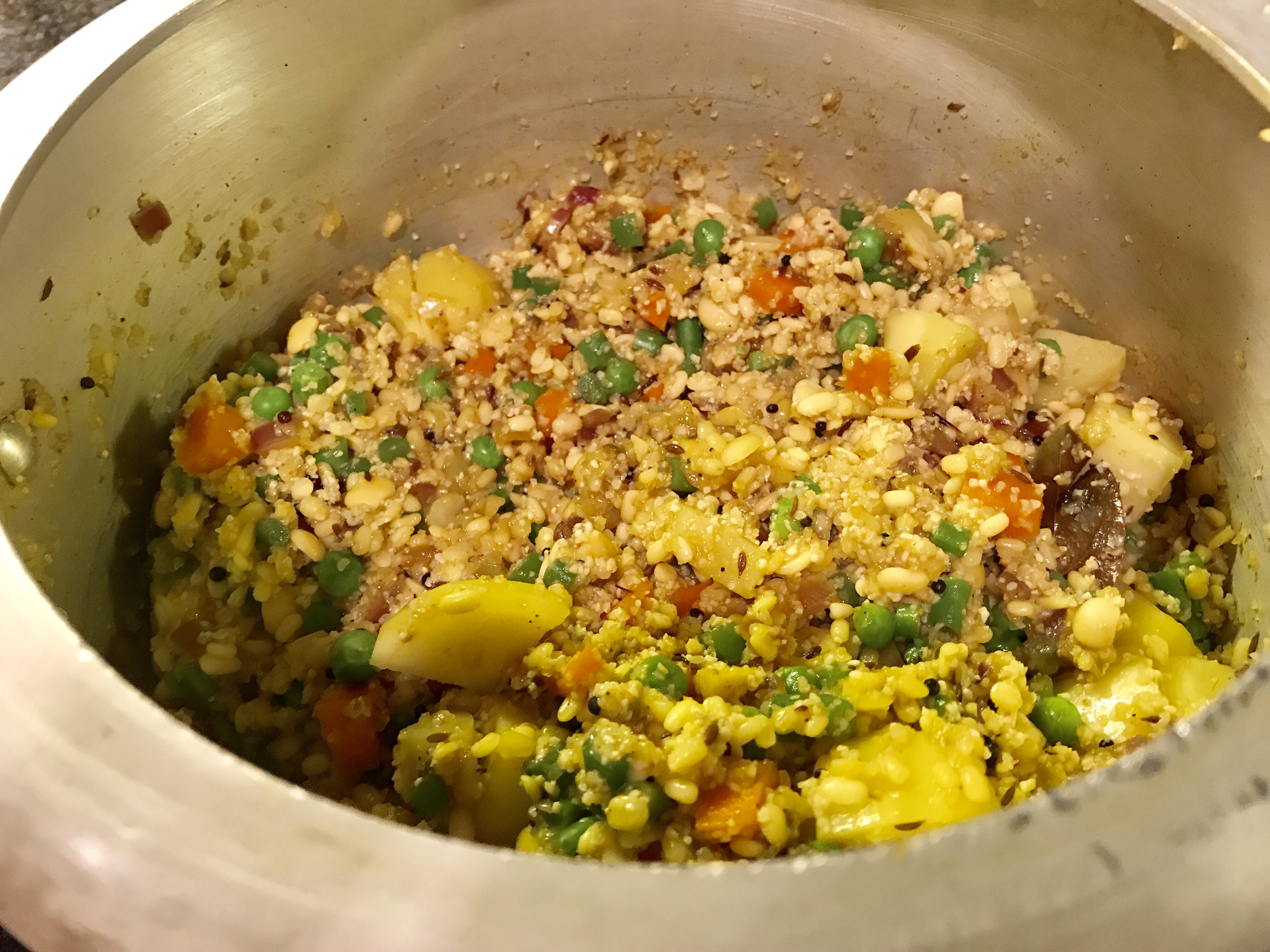 In a large pressure cooker, add a tablespoon of ghee. Add the whole spices and cumin seeds. Add the carrots, peas and potatoes and sauté on medium heat for a few minutes. Add the ginger-garlic-green chilli paste and sauté for a minute. Add the ground spices and stir and mix well. Add the lentils mixture and mix well. Add the water and salt to taste. Cover with the pressure cooker lid and let it cook on high for 2 whistles and then on low heat for 5-7 minutes. The lentils and bulgur should be cooked and tender.