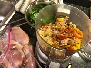 Marinate the chicken for at least 4 hours. I toss it altogether in a ziplock bag, easy or no-clean up for later.