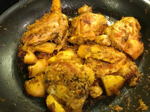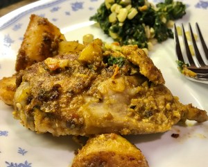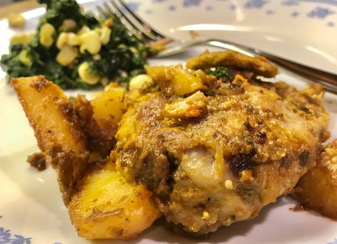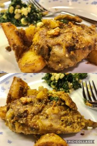 One more thing – if one desires some gravy in the dish, add a little water or stock toward the end. Otherwise, it can be left on the dry side, with the marinade well absorbed in the chicken and potatoes.