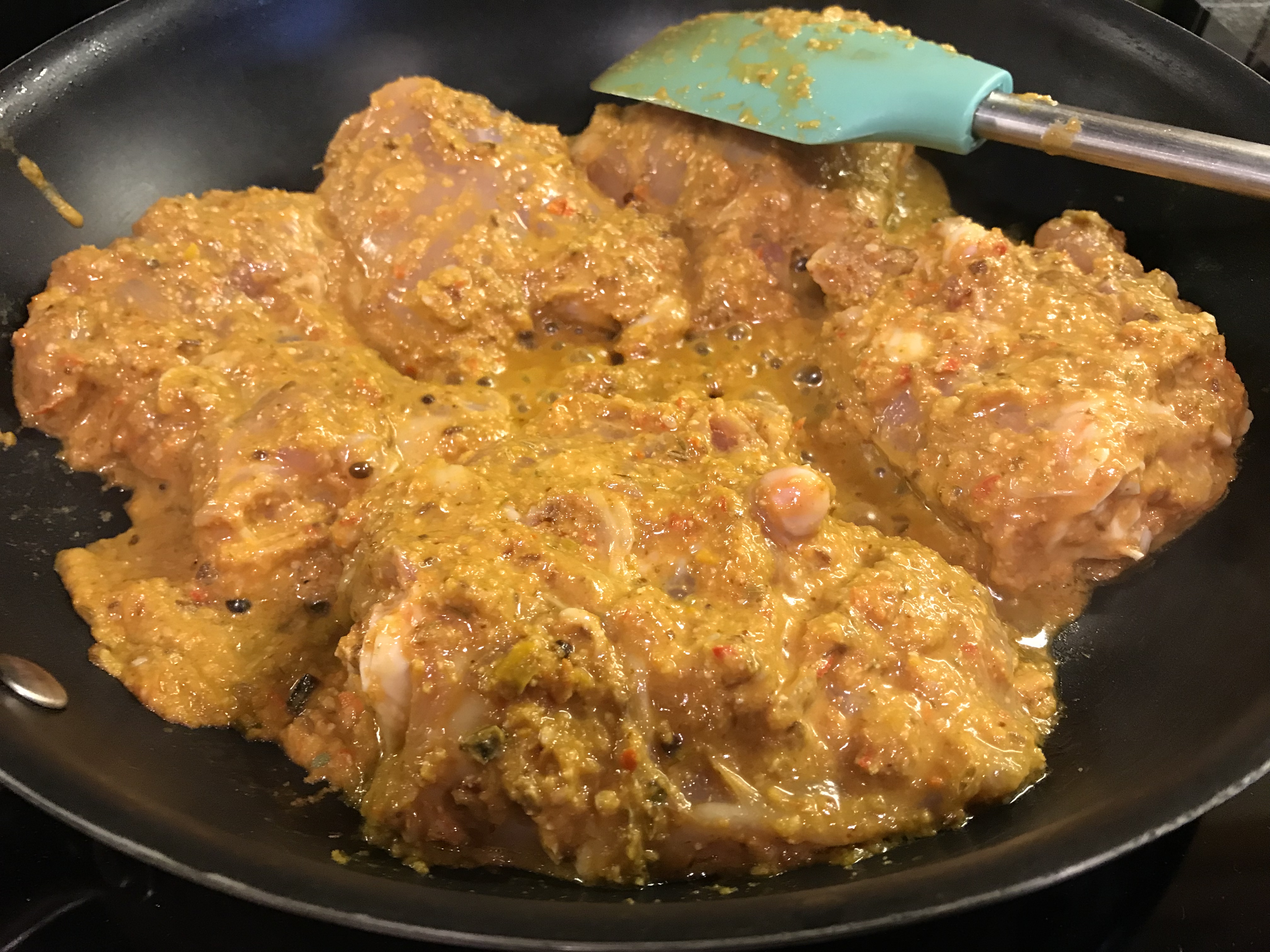 Heat a non stick pan on high heat. Add little oil (the marinade already has oil). Add the marinated chicken. Brown on both sides for a few minutes. Lower heat, add a little water and scrape out all the masala marinade at the bottom of pan, stir and cover and simmer till chicken is tender and cooked.