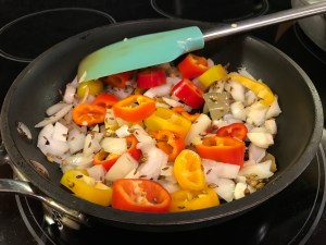 Sauté the bell peppers, onions, garlic and whole spices in a tablespoon of oil, for 3-4 minutes, till the veggies start sweating. Remove from heat and let cool.