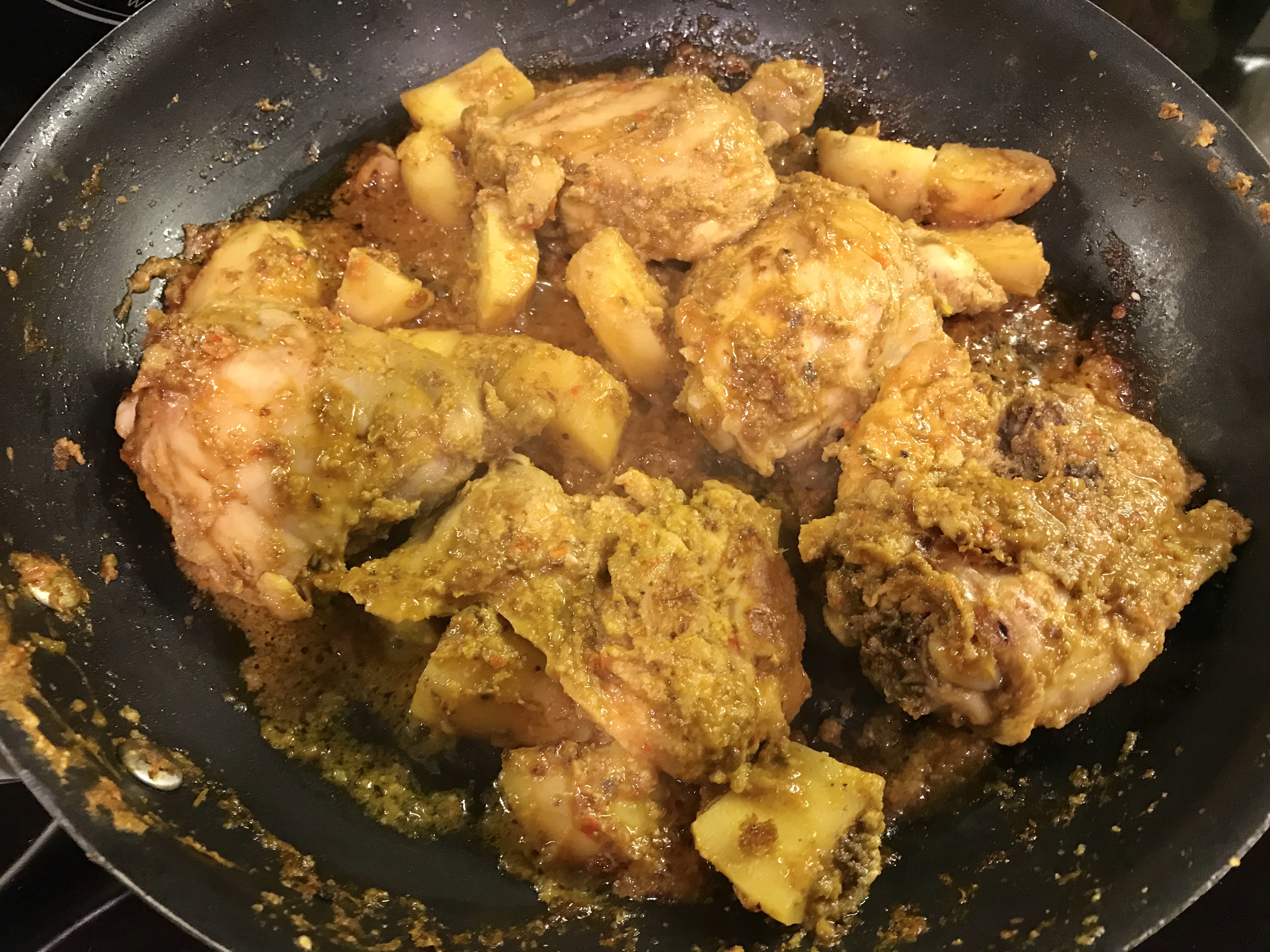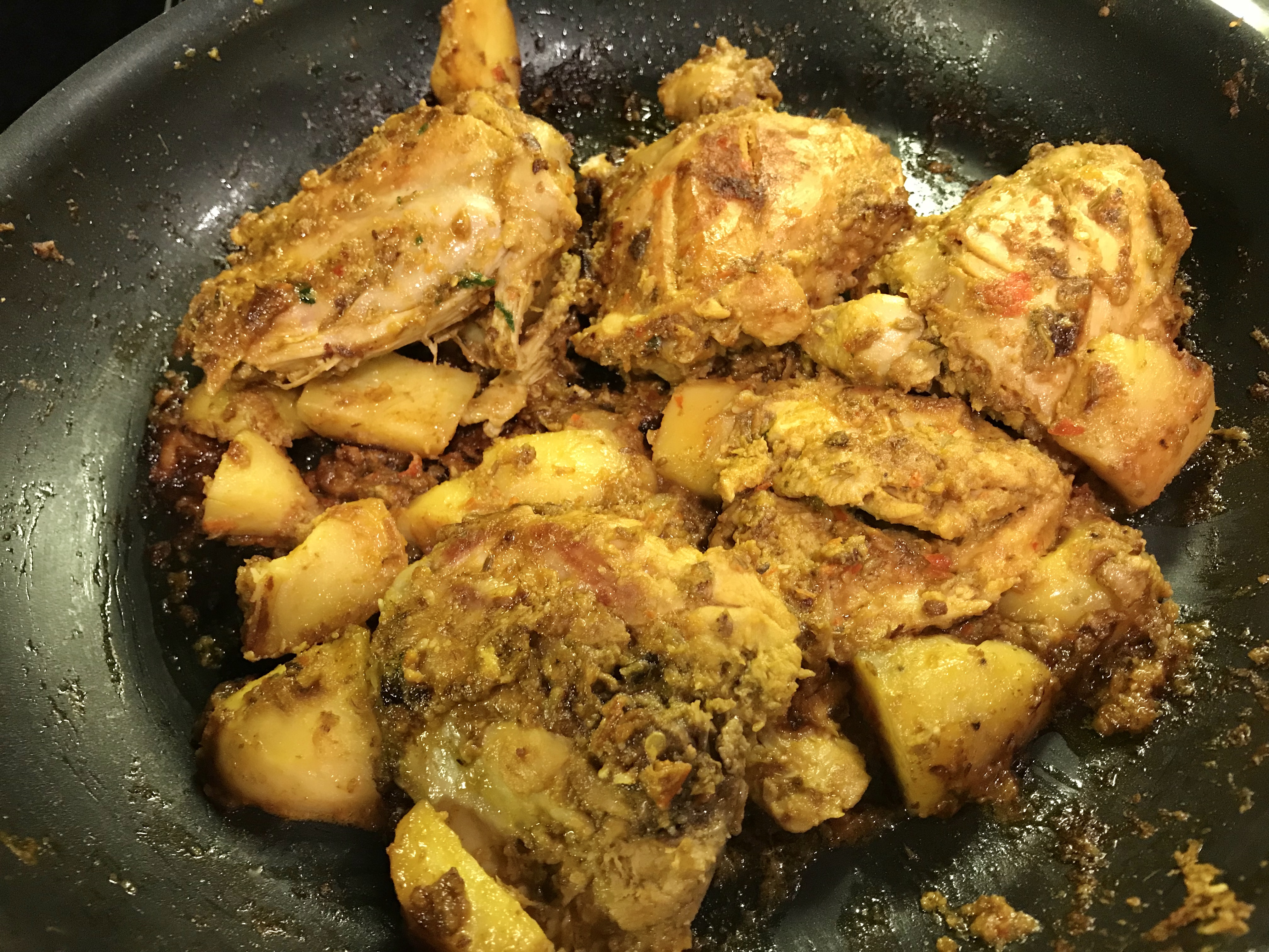 Chicken thighs, marinated and cooked with bell peppers, chillies, cashew nuts, spices and condiments. Some potatoes tossed in too.